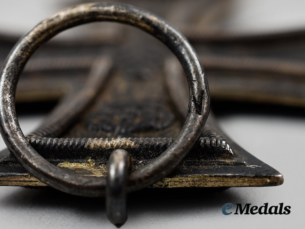 1. A 1914 Iron Cross II Class, constructed of iron and silver, on loop for suspension with its period original ribbon, consisting of a Cross Pattée with a blackened magnetic iron core within a ribbed silver frame, the obverse with a central initial “W”, the six o’clock arm with a restitution date of “1914”, the twelve o’clock arm with a royal crown, the reverse with three central oak leaves, the six o’clock arm with an initial institution date of “1813”, the twelve o’clock arm with initials “FW” topped by a royal crown, the suspension loop maker marked with an “N” or “Z”, measuring 42.10 mm (w) x 45.91 mm (h), 17.0 grams, demonstrating a consistent patina throughout with some distortion of the frame of the twelve o’clock arm, in very fine condition.