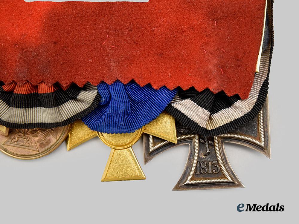 All suspended from a 150 mm-long bar with a bronze core, horizontal pinback, and red wool reverse liner, demonstrating moderate soiling throughout the ribbons and liner, an untouched and original example for a experienced participant of the military campaigns which led to the formation of modern Germany in very fine condition.