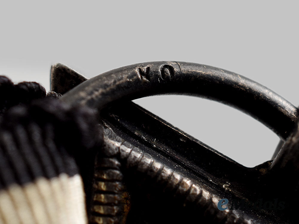 1. A 1914 Iron Cross II Class, constructed of iron and silver, on loop for suspension with its period original ribbon, consisting of a Cross Pattée with a blackened magnetic iron core within a ribbed silver frame, the obverse with a central initial “W”, the six o’clock arm with a reinstitution date of “1914”, the twelve o’clock arm with a royal crown, the reverse with three central oak leaves, the six o’clock arm with an initial institution date of “1813”, the twelve o’clock arm with initials “FW” topped by a royal crown, the suspension loop maker marked “KO” for a widely documented but unidentified manufacturer, measuring 42.90 mm (w) x 47.88 mm (h), demonstrating sporadic oxidation to the core with a consistent patina throughout the frame, in very fine condition.