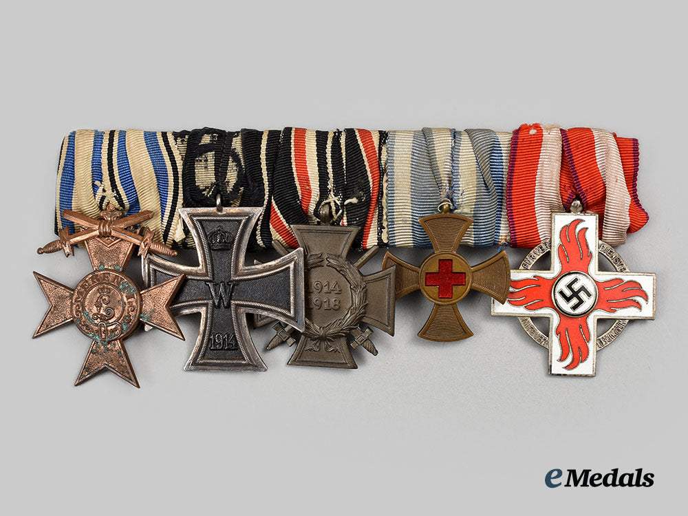 (Ordensschnalle). A medal bar for a First World War combatant with postwar fire brigade service, featuring five awards, including:
