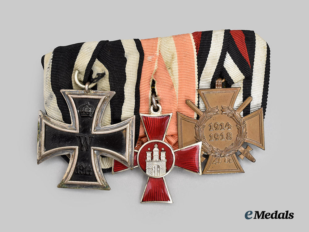 (Ordensschnalle). A medal bar for a First World War combatant featuring three decorations, including: