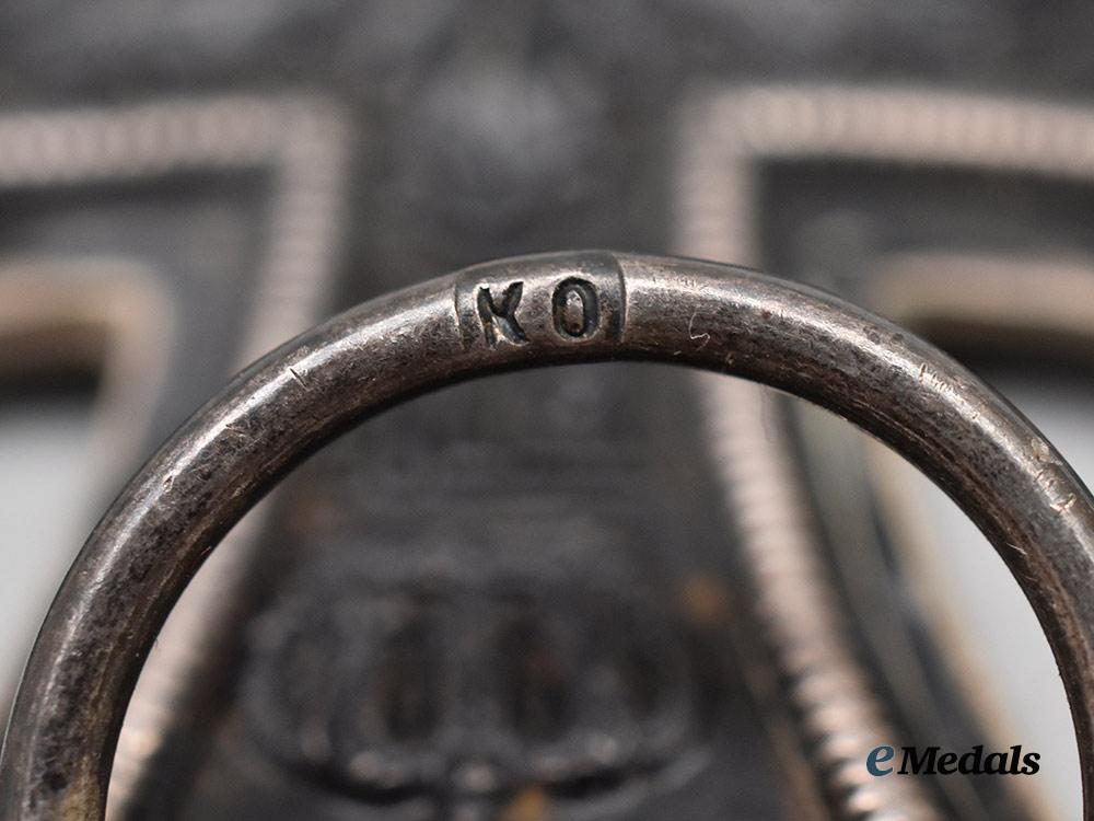 1. A 1914 Iron Cross II Class, constructed of iron and silver, on loop for suspension with its period original ribbon, consisting of a Cross Pattée with a blackened magnetic iron core within a ribbed silver frame, the obverse with a central initial “W”, the six o’clock arm with a reinstitution date of “1914”, the twelve o’clock arm with a royal crown, the reverse with three central oak leaves, the six o’clock arm with an initial institution date of “1813”, the twelve o’clock arm with initials “FW” topped by a royal crown, the suspension loop maker marked “KO” for a widely-documented but unidentified manufacturer, measuring 43.28 mm (w) x 48.10 mm (h), weighing 16.5 grams, in extremely fine condition.