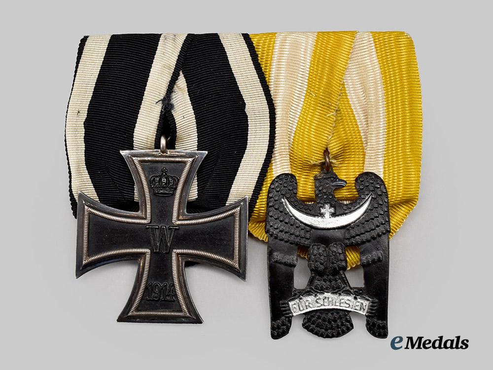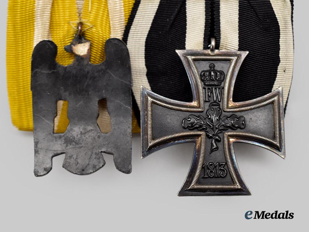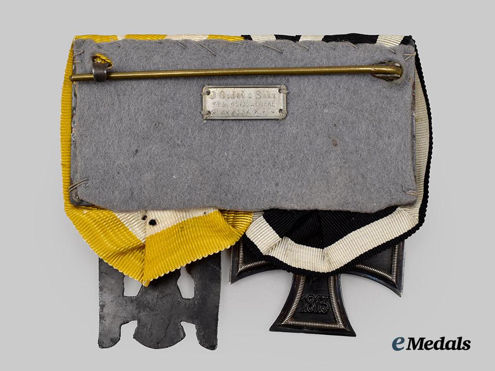 Both suspended from a 85 mm-long bar with a magnetic metal core, horizontal pinback, and grey wool liner, retaining a metal maker’s label reading “J. GODET & SOHN, KGL HOFJUWELIERE, BERLIN W8”, a high-quality example assembled by one of Germany’s pre-eminent manufacturers of orders and medals in extremely fine condition.