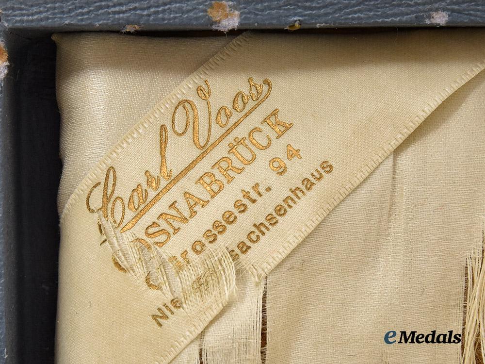 Both secreted within a period case, constructed of a wooden frame with a faux blue-grey leather exterior liner, the lid bearing a partially-legible handwritten award inventory which includes the 1914 Iron Cross, the interior with a white satin lid liner and intact hinge cover, with a padded cream-coloured wool medal bed, retaining a maker’s label reading “CARL VOOS, OSNABRÜCK”, closing with two functional snap buttons, measuring 24 cm (w) x 11.5 cm (l) x 4 cm (h), demonstrating moderate material fatigue, a period and mis-matched example in very fine condition