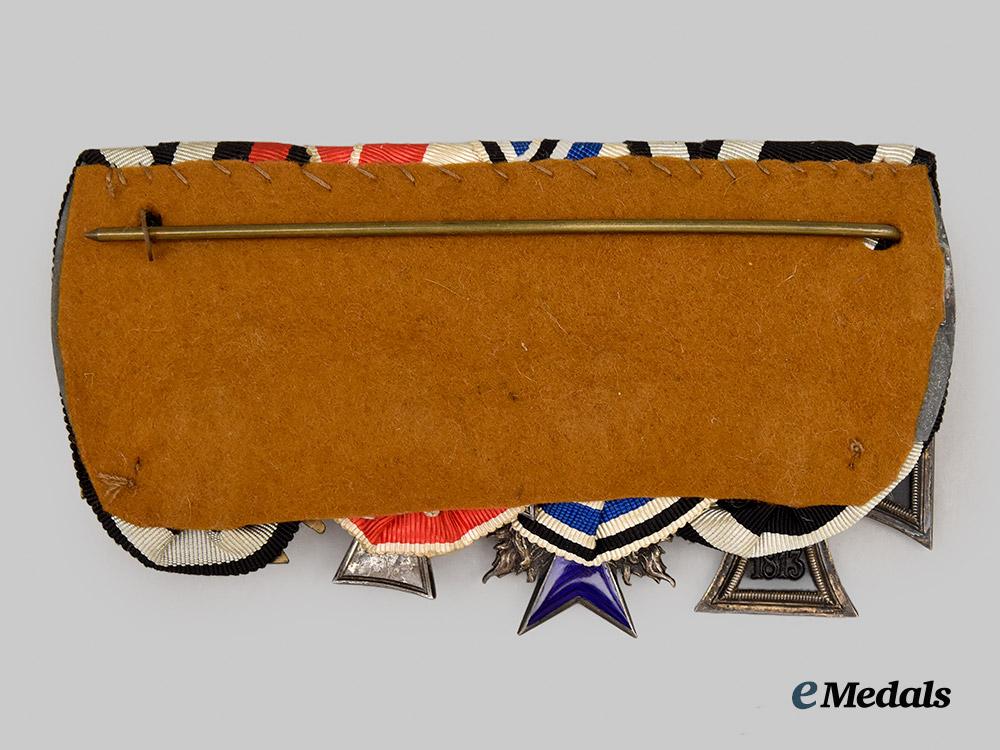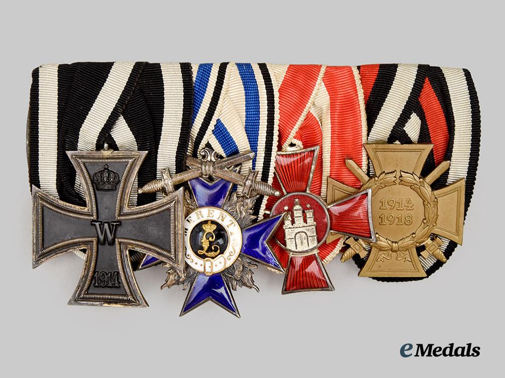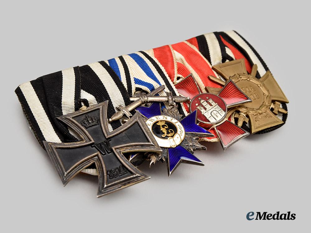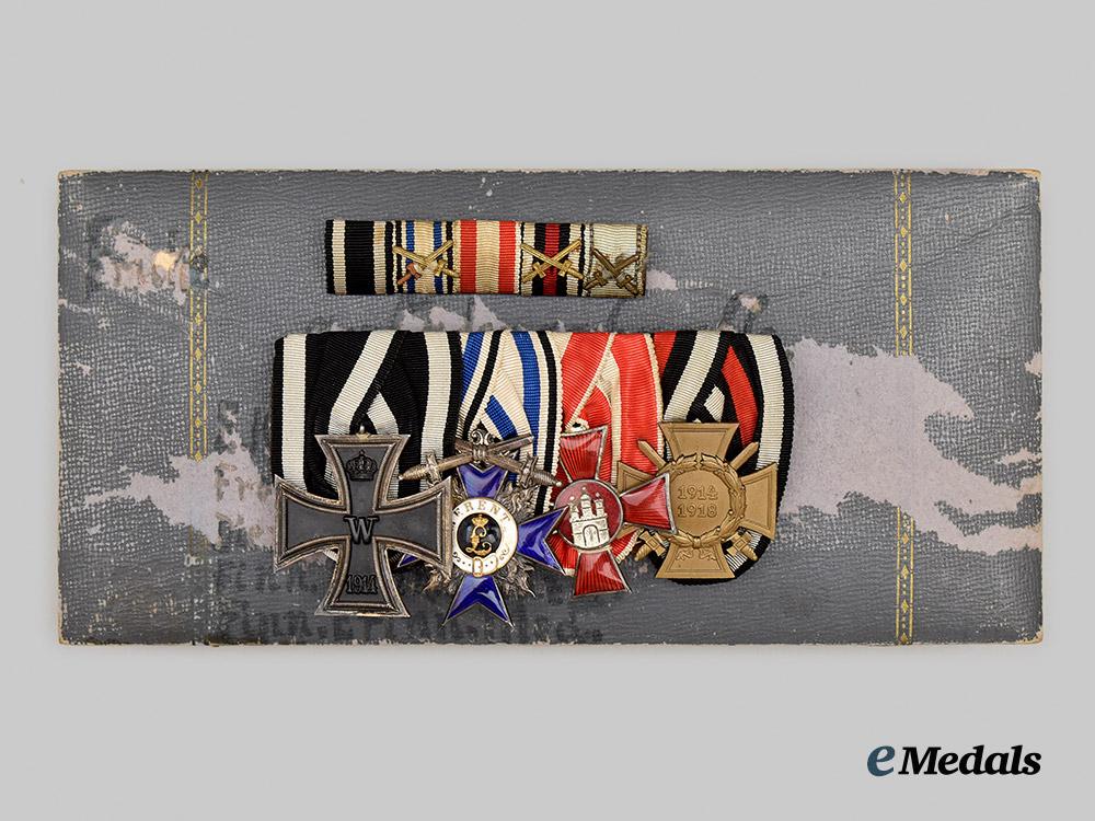 Accompanied by a ribbon bar, featuring a 1914 Iron Cross II Class, a Bavarian Order of Military Merit with Swords, a Hamburg Hanseatic Cross, an Honour Cross of the World War 1914/1918 for Combatants, and a Bulgarian Medal of Merit with Swords, affixed to a 75 mm-long magnetic metal bar with a horizontal pinback, unmarked, demonstrating soiling to the ribbons and some surface oxidation to the core, in very fine condition.