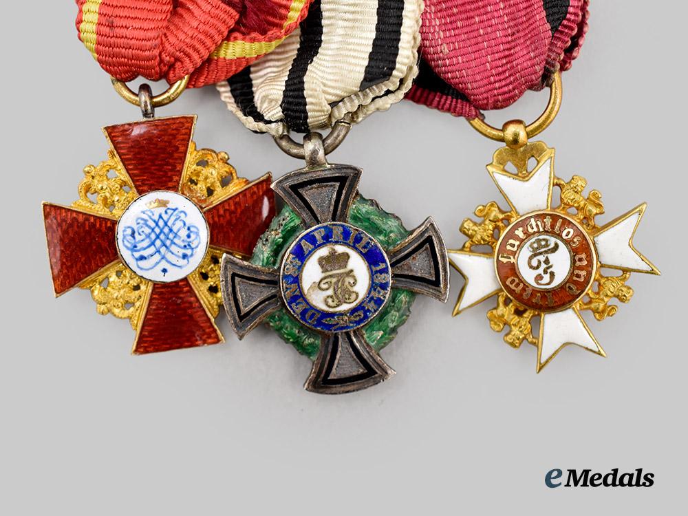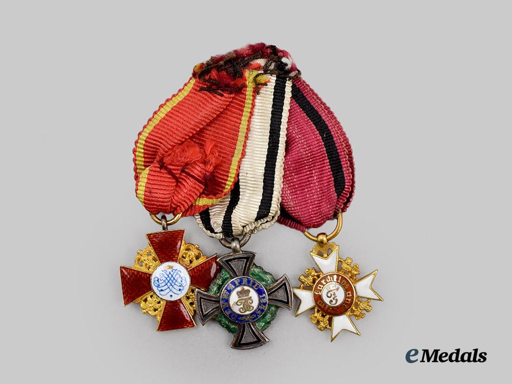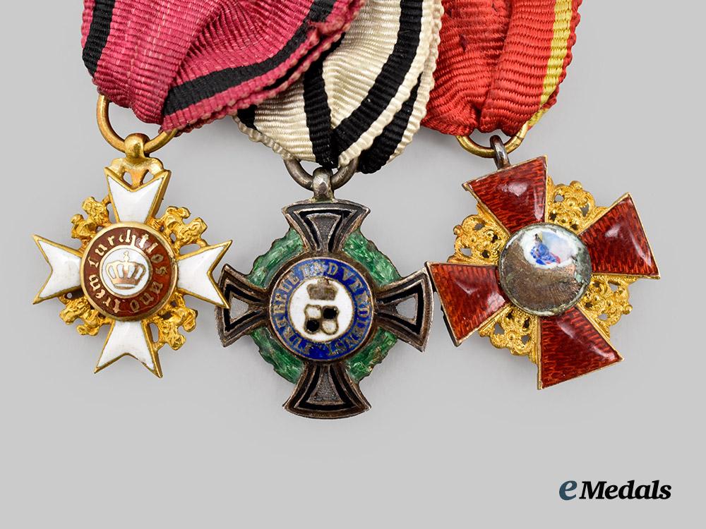 (Ordensschnalle Miniatur). A miniature order bar to a distinguished Württemberg citizen featuring three decorations, including a Württemberg Order of the Crown, constructed of Gold with gilt and multi-coloured enamels, unmarked, measuring 15.64 mm (w) 18.49 mm (h), demonstrating minor flecking to the enamels, in extremely fine condition; a House Order of Hohenzollern, constructed of silver with multi-coloured enamels, on loop for suspension from its period original ribbon, unmarked, measuring 16.76 mm (w) x 19.26 mm (h), demonstrating minor flecking throughout the enamels, in near extremely fine condition, and; a Russian Order of St. Anna, constructed of gilded silver with multi-coloured enamels, on loop for suspension from its period original ribbon, unmarked, measuring 16.86 mm (w) x 19.69 mm (h), demonstrating a large chip to the obverse centre medallion, in very fine condition.