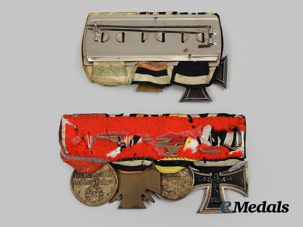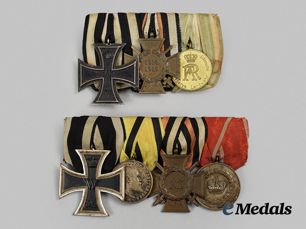 1. One featuring three decorations, including a 1914 Iron Cross II Class, constructed of iron and silver, on loop for suspension with its period original ribbon, consisting of a Cross Pattée with a blackened magnetic iron core within a ribbed silver frame, the obverse with a central initial “W”, the six o’clock arm with a reinstitution date of “1914”, the twelve o’clock arm with a royal crown, the reverse with three central oak leaves, the six o’clock arm with an initial institution date of “1813”, the twelve o’clock arm with initials “FW” topped by a royal crown, without visible marks, measuring 42.25 mm (w) x 45.61 mm (h), in near extremely fine condition; an Honour Cross of the World War 1914/1918 for Combatants, constructed of bronzed magnetic metal, on loop for suspension with its period original ribbon, consisting of a Cross Pattée with crossed swords piercing the centrepiece, the obverse bearing central wreathed dates “1914-1918”, the reverse marked with the logo of an unidentified manufacturer, measuring 37.25 mm (w) x 41.84 mm (h), in near extremely fine condition, and; a Saxon Landwehr Long Service Award, II Class, constructed of bronze, on loop for suspension with its period original ribbon, unmarked, measuring 28.24 mm in diameter, in near extremely fine condition; all suspended from a 92 mm-long magnetic metal bar with a horizontal pinback, demonstrating moderate soiling and fatigue throughout the ribbons, in very fine condition.