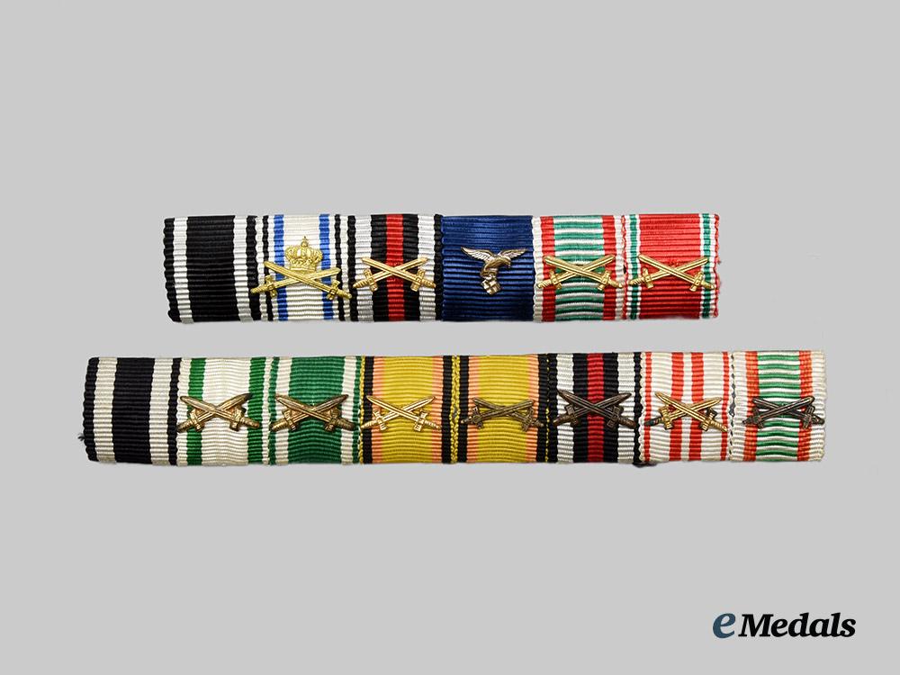2. One featuring six decorations, including a 1914 Iron Cross II Class, a Bavarian Military Merit Cross with Crown and Swords, an Honour Cross of the World War 1914/1918 for Combatants, a Wehrmacht Long Service Award with Luftwaffe device, a Hungarian War Commemorative Medal, and a Bulgarian War Commemorative Medal, all affixed to a 90 mm-long bar with a magnetic metal core and horizontal pinback, unmarked, in extremely fine condition.
