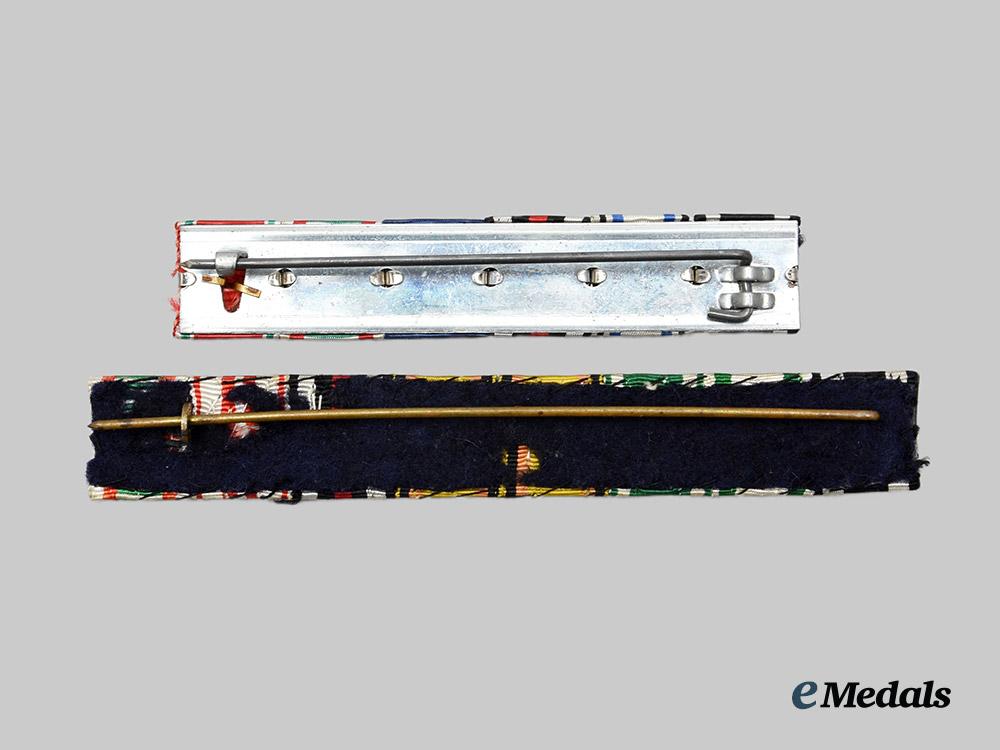 1. One featuring eight decorations, including a 1914 Iron Cross II Class, a Saxon Order of Merit with Swords, a Saxon Albert Order with Swords, a Reuss Princely Honour Cross with Swords, a Waldeck Order of Merit with Swords, an Honour Cross of the World War 1914/1918 for Combatants, an Austrian War Commemorative Medal, and a Hungarian War Commemorative Medal, all affixed to a 120 mm-long zink bar with a horizontal pinback and blue wool reverse liner, unmarked, demonstrating some mothing to the liner, in near extremely fine condition.