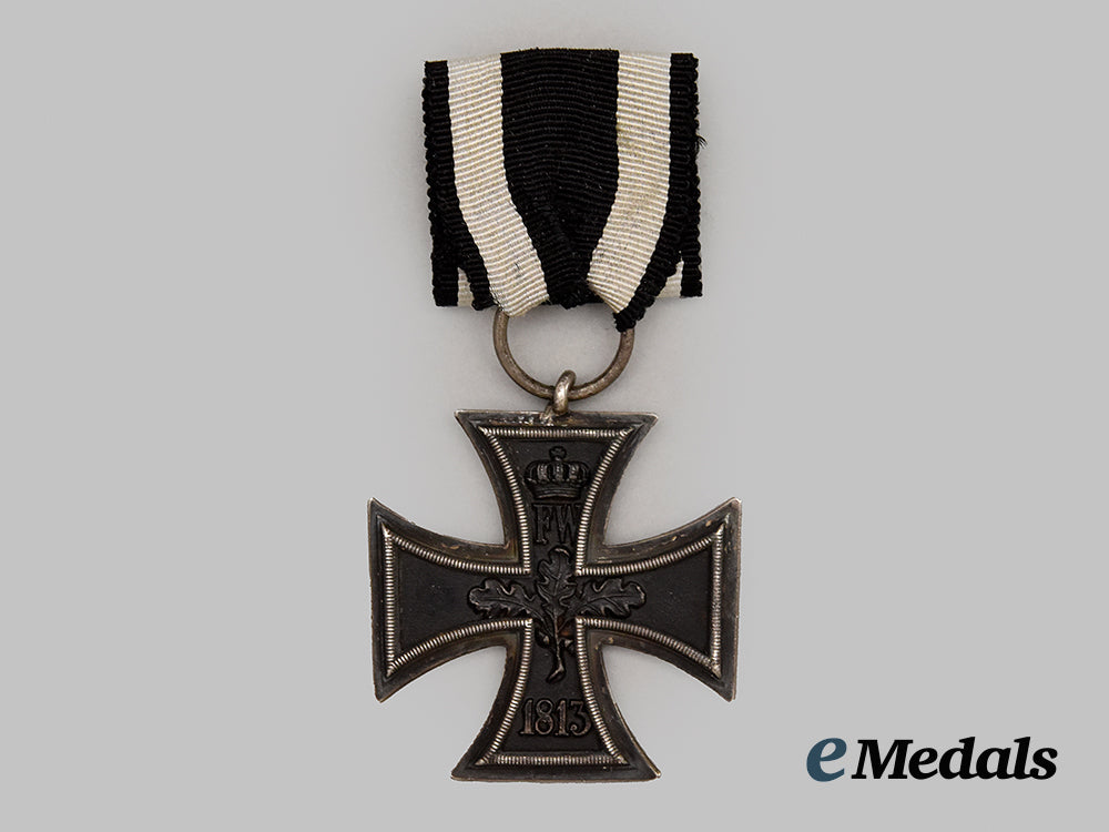 (Eisernes Kreuz 1870 II. Klasse). Reinstituted 19 July 1870 by King Wilhelm I. (1870-1871 issue). Constructed of iron and silver, consisting of a Cross Pattée with a blackened magnetic iron core within a ribbed silver frame, the obverse with a central initial “W”, the six o’clock arm with a reinstitution date of “1870”, the twelve o’clock arm with a royal crown, the reverse with three central oak leaves, the six o’clock arm with an initial institution date of “1870”, the twelve o’clock arm with initials “FW” topped by a royal crown, unmarked, measuring 41.66 mm (w) x 46.24 mm (h), weighing 16.4 grams, demonstrating minor loss of finish to the core, in near extremely fine condition.