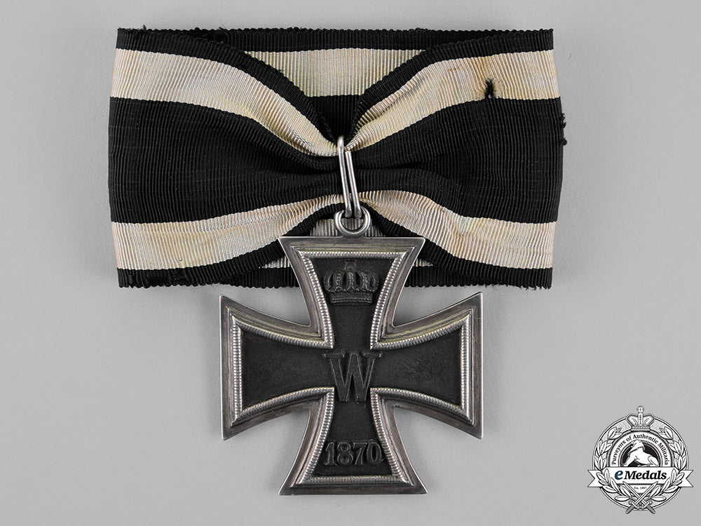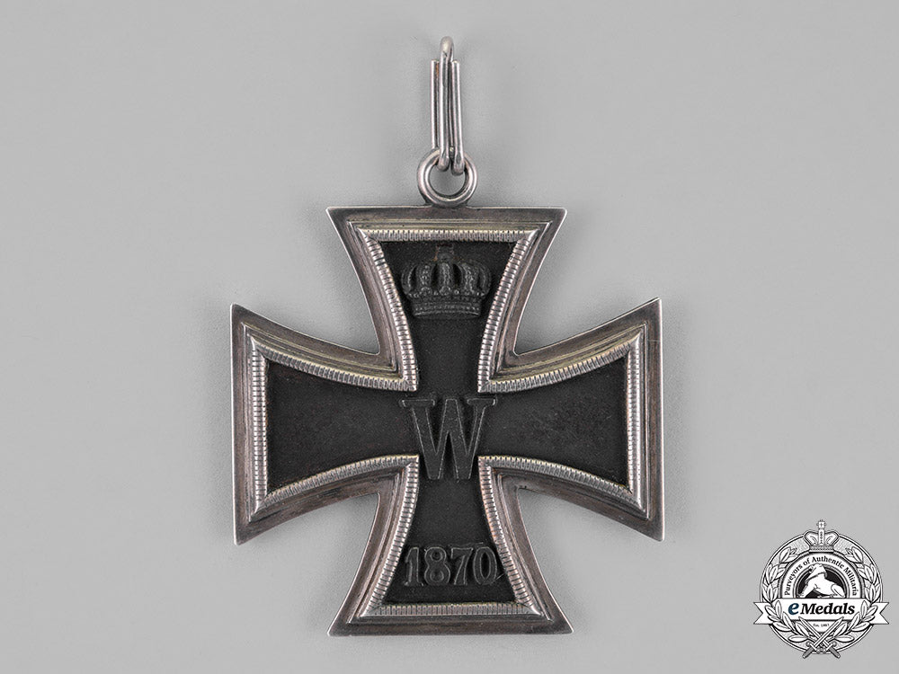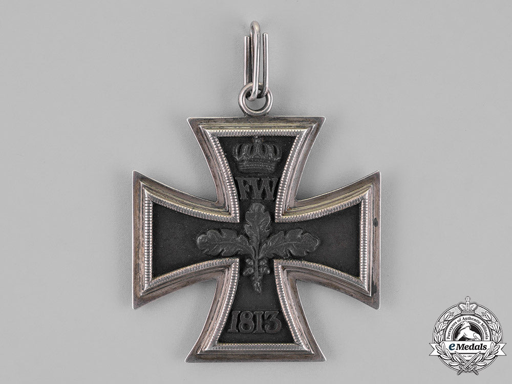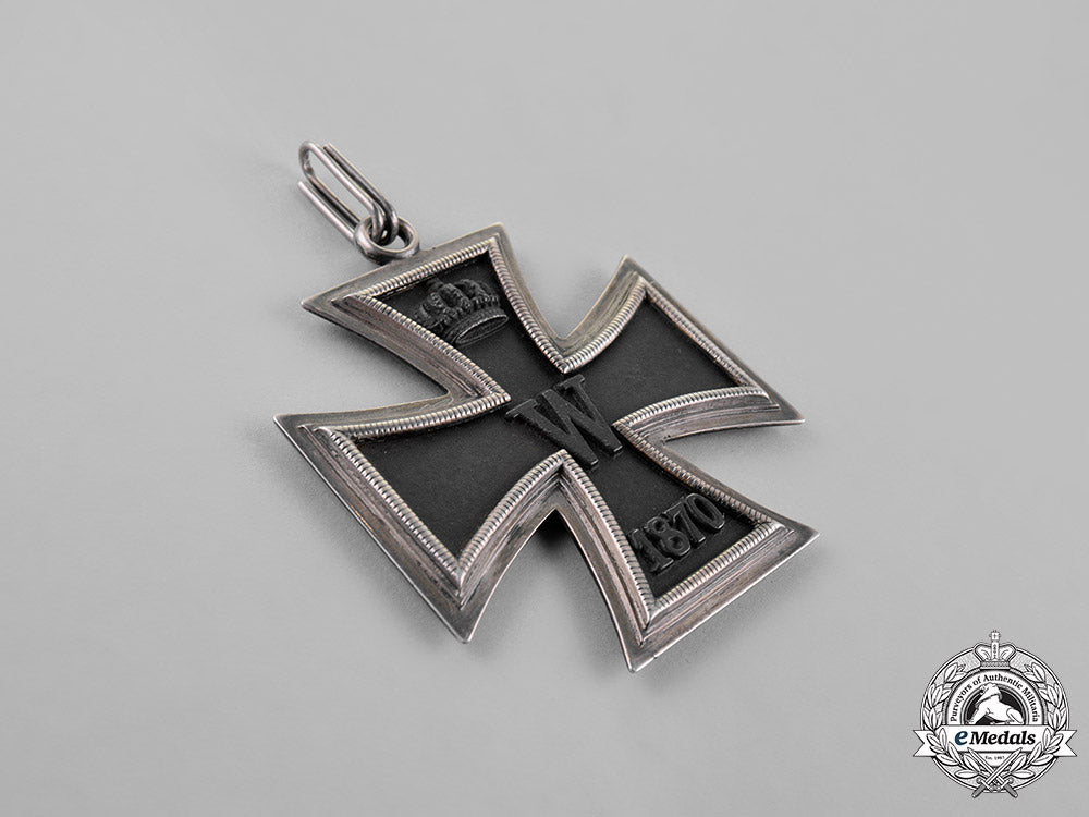(Großkreuz des Eisernen Kreuzes). A cross pattée of multi-piece construction with a blackened iron core (magnetic) within a ribbed silver frame; on a double-looped ring for suspension from its shortened period original ribbon; the obverse with a raised central “W”, with the re-institution date “1870” in raised numbering on the lower arm, and the royal crown on the upper arm; the reverse with a central oak-leaf branch consisting of three oak leaves, with the original institution date “1813” in raised numbers on the lower arm, a raised Prussian crown on the upper arm, with “FW” in equally raised lettering directly below; measuring 63.45 mm (w) x 72.33 mm (h); weighing 49.7 grams; in overall better than extremely fine condition.
