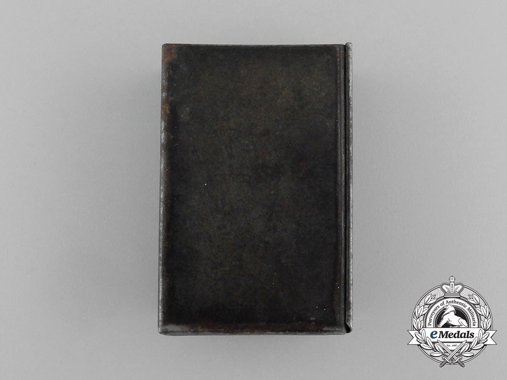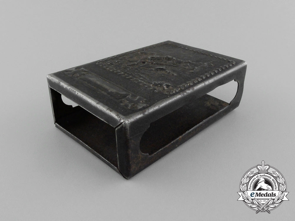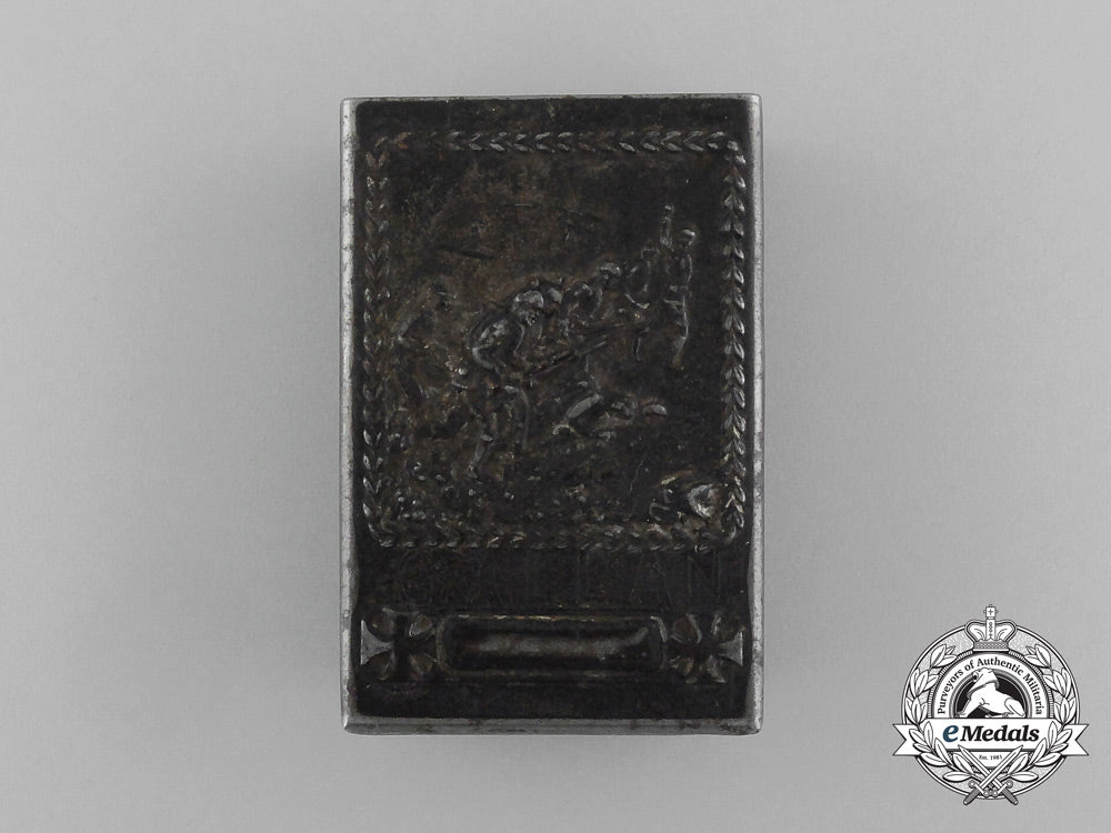 A First War (Imperial) German matchbox cover, depicting a group of German soldiers storming a trench; constructed of pressed sheet medal (magnetic); crimped on one side; with two of the sides partially cut out to allow the fingers to slide the matchbox out of the cover once empty, and to strike the match on the igniter strip; with a cut-out on the bottom to push out the matchbox drawer; measuring 61 mm x 40 mm; dark attractive patina with contact marks from use; overall better than fine condition.