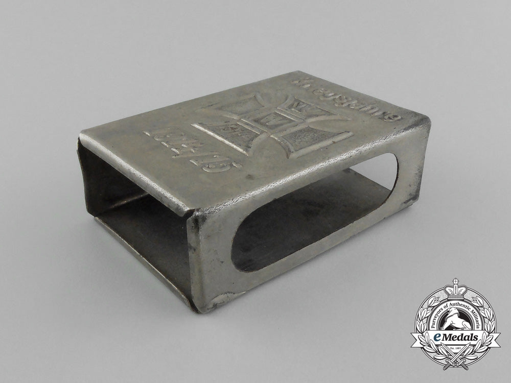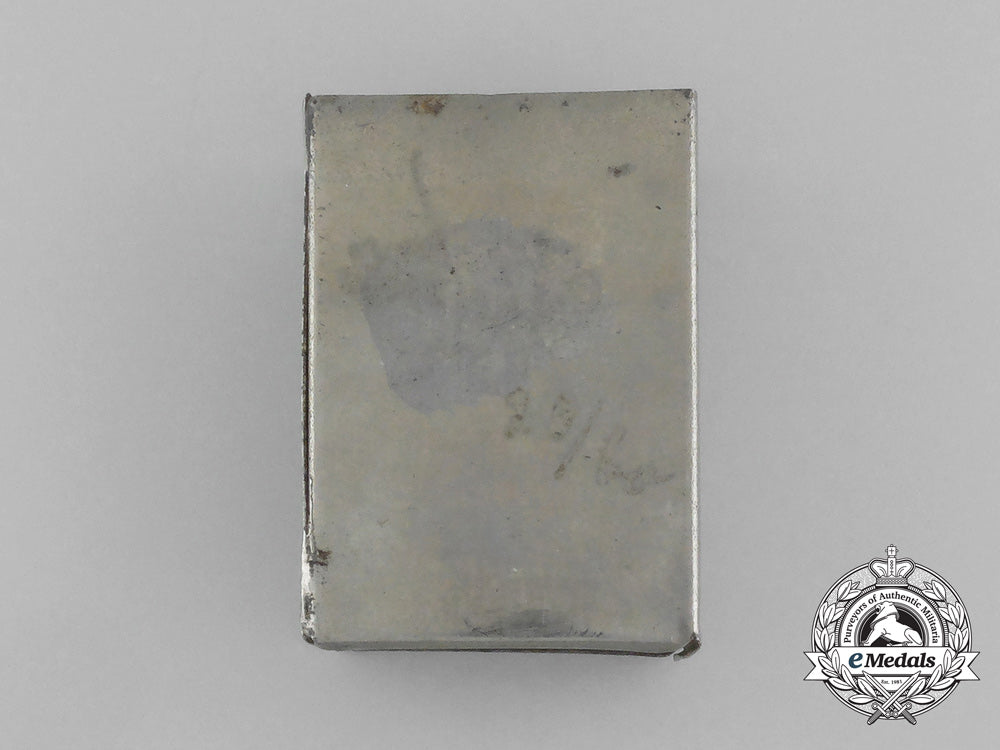 A First War (Imperial) German matchbox cover, depicting an Iron Cross 1914 First Class with the inscriptions “Kriegsjahre 1914/15” (Wartime Years 1914/15); constructed of pressed sheet metal (magnetic); soldered on one side; with two of the sides partially cut out to allow the fingers to slide the matchbox out of the cover once empty, and to strike the match on the igniter strip; with a cut-out on the bottom to push out the matchbox drawer; measuring 60 mm x 40 mm; light patina with light contact marks from use; overall better than very fine condition.
