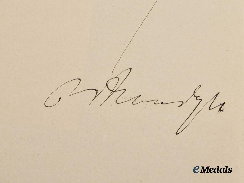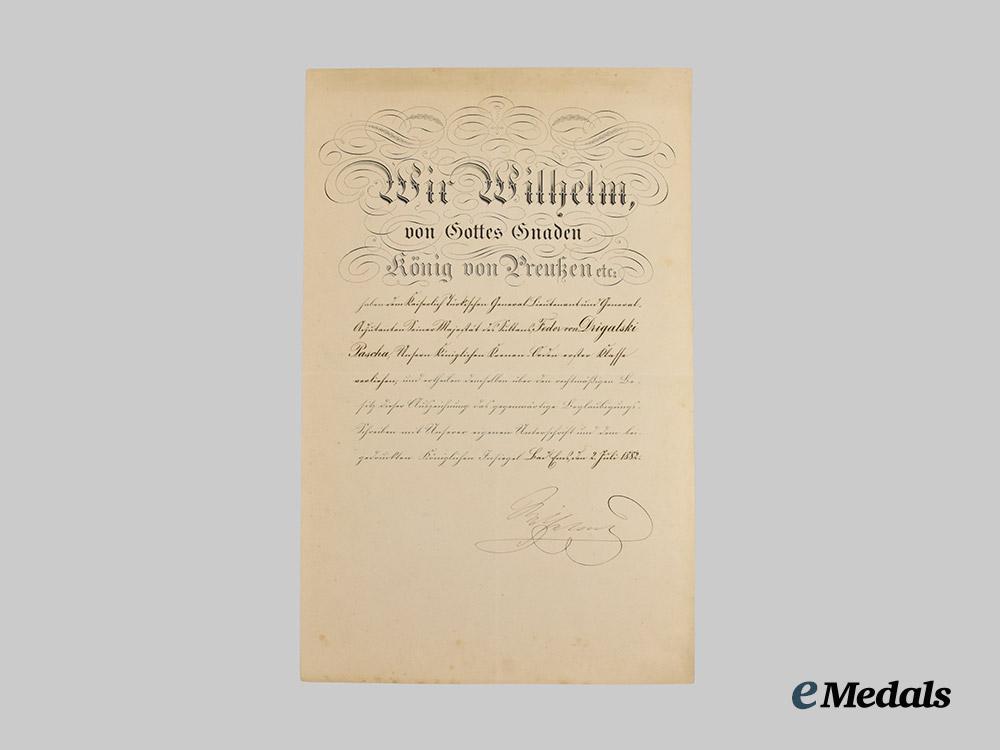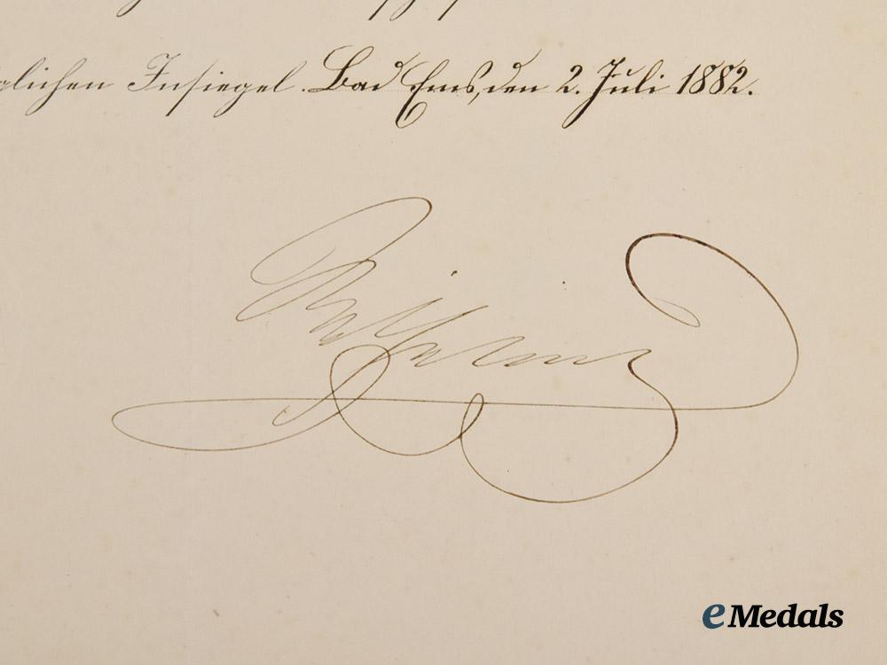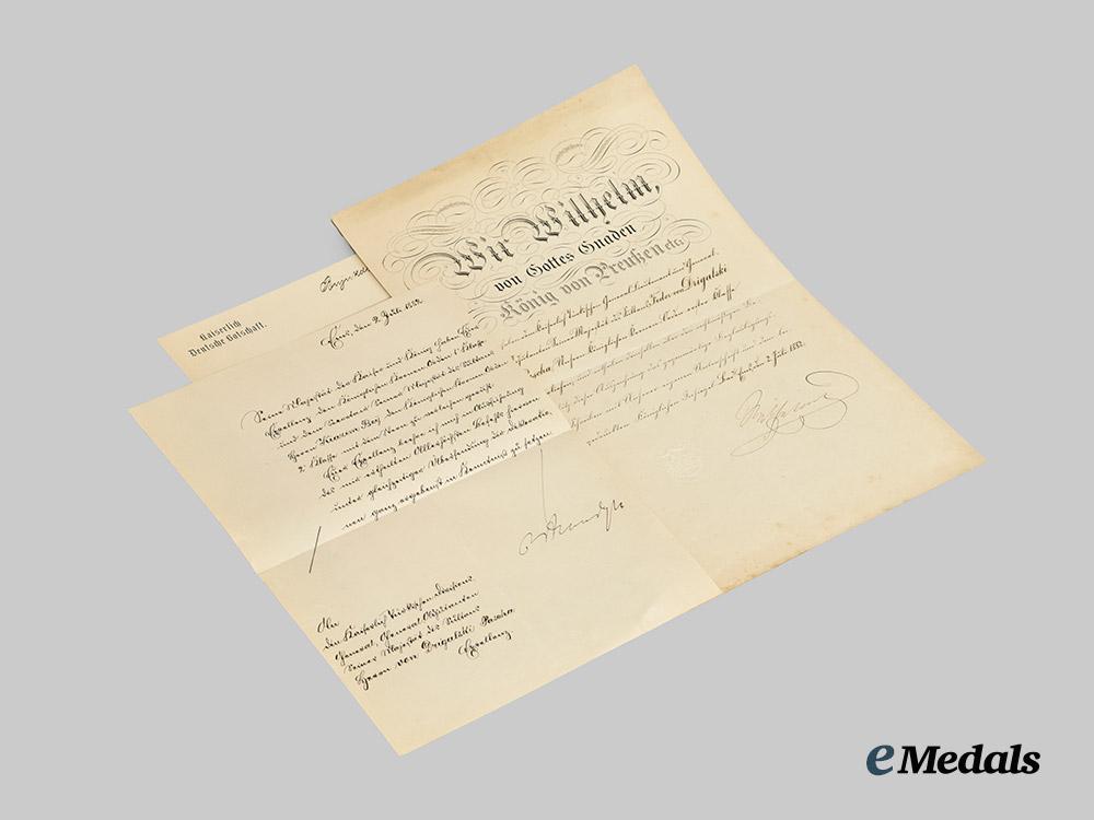 1. An award document to Generalleutnant and Generaladjutant of the Sultan, Fedor von Drigalski-Pascha, for an Order of the Crown I. Class, issued in Bad Ems on July 2nd, 1882, and bearing the signature as well as the seal of King of Prussia and Emperor of the Holy Roman Empire, Kaiser Wilhelm I, consisting of a large page of paper folded in half along the landscape axis with partially printed and neatly handwritten writing, measuring 226 mm (w) x 356 mm (l) as presented, without tears, folds, or major staining of any kind, in overall better than extremely fine condition.