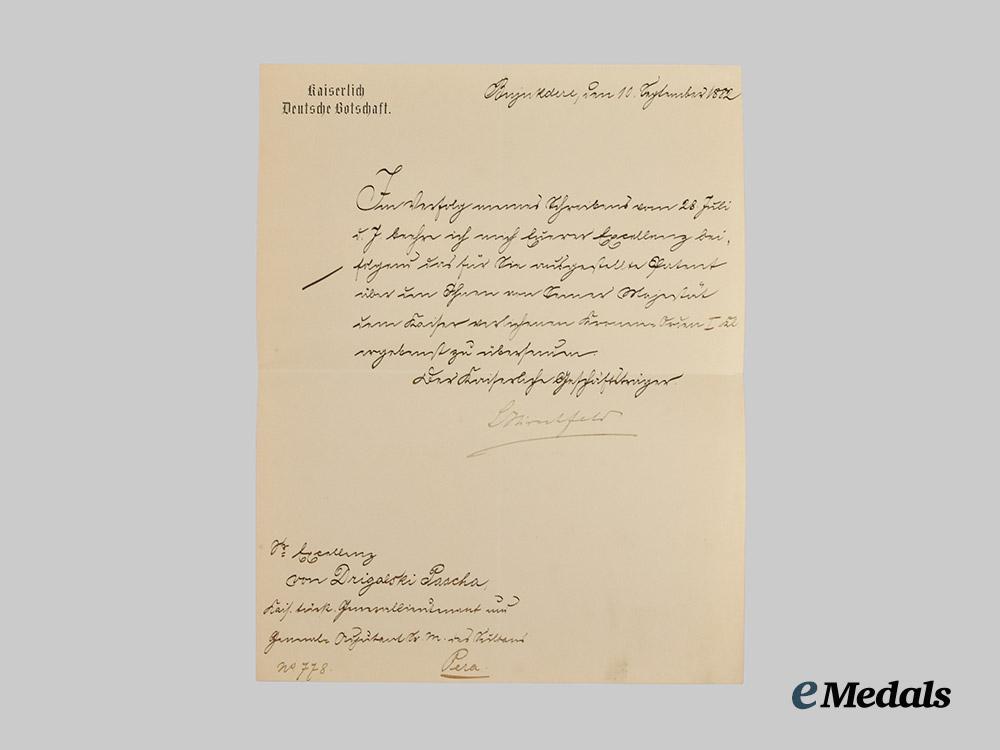 2. An accompanying letter for the Order of the Crown I. Class to Generalleutnant and Generaladjutant of the Sultan Fedor von Drigalski-Pascha, issued in Bujukdere on December 10th, 1882, consisting of a large page of paper folded in half along the landscape and portrait axis with handwritten writing, measuring 222 mm (w) x 283 mm (l) as presented, without tears, folds, or major staining of any kind, in overall better than extremely fine condition.