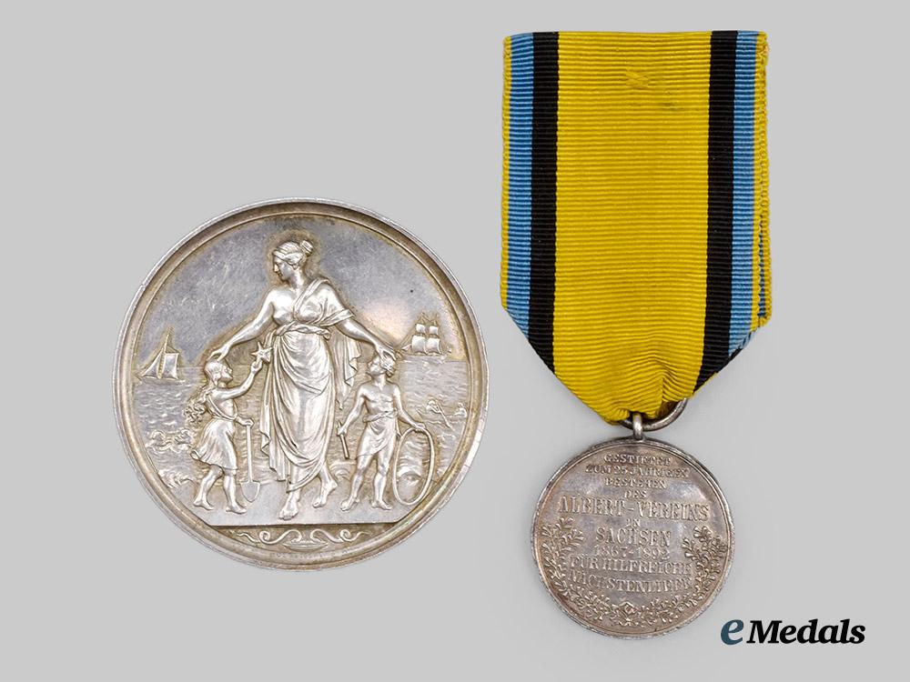 1. A Saxony Carola Medal, Type II, a circular medal constructed of silver, the obverse depicting the rightward facing effigy of Carolina of Austria, circumscribed “Carola Königin von Sachsen” (Carola Queen of Saxony), the reverse inscribed “Gestiftet zum 25 Jährigen bestehen des Albert-Vereins in Sachsen 1867-1892 Für Hilfreiche Nächstenliebe” (Founded for the 25th anniversary of the Albert Association in Saxony 1867-1892 For Helpful Charity) in capitalized lettering within an oak wreath, on a loop for suspension from its period-original ribbon, measuring 27.6 mm in diameter, weighing 15.58 grams