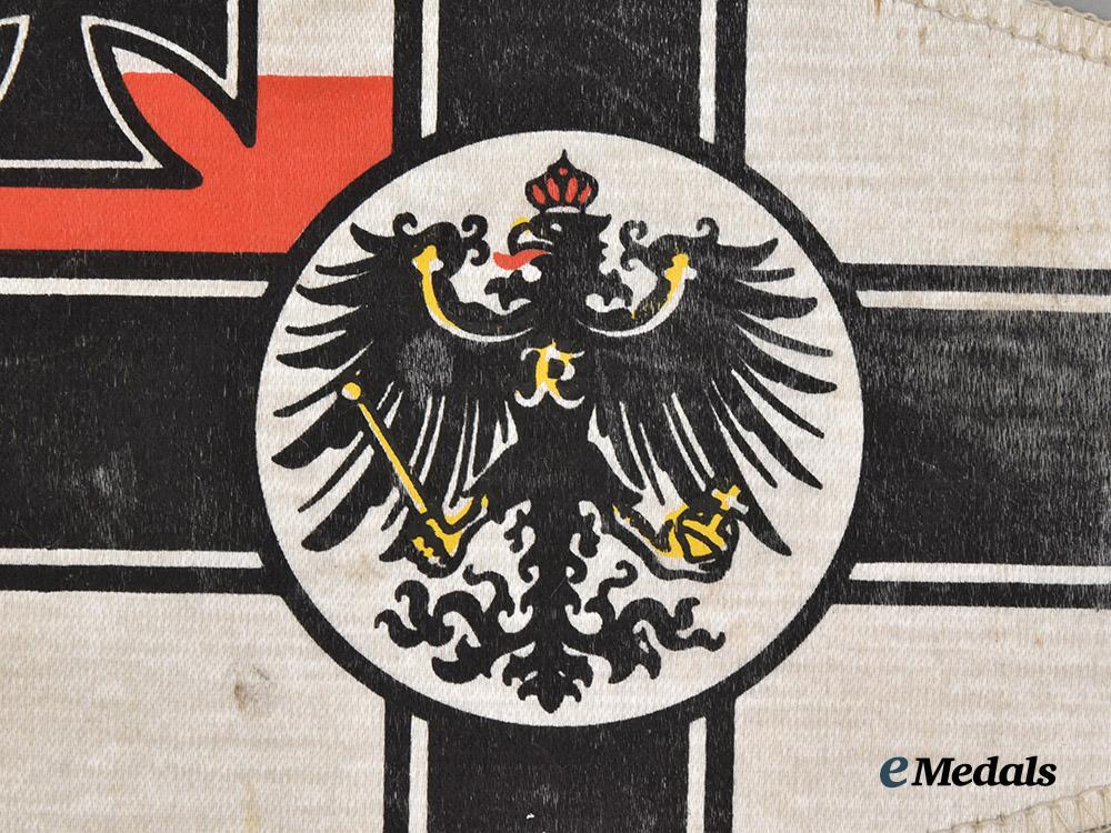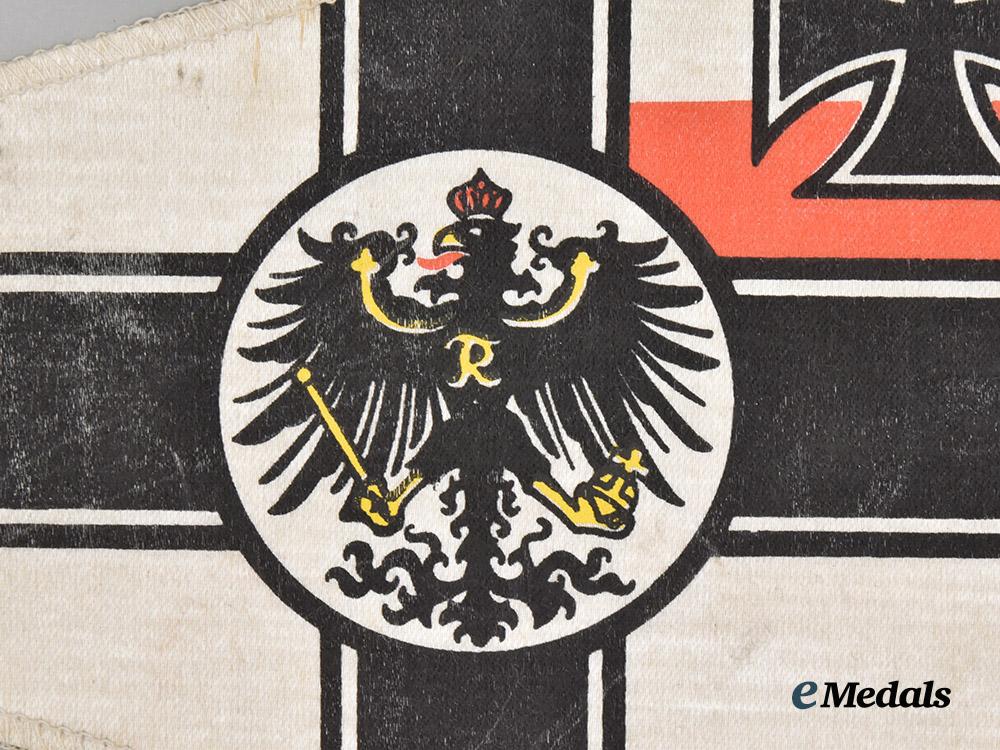 (Reichskriegsflagge-Schiffchen). 1903-1919 pattern. An elongated triangle, constructed of printed rayon-blended fabric, the obverse and reverse with the 1903-1919 pattern of the Reichskriegsflagge (War Ensign of Germany), with two red-and-white intertwined strings for mounting, measuring 263 mm (w) x 155 mm (l), in better than very fine condition.