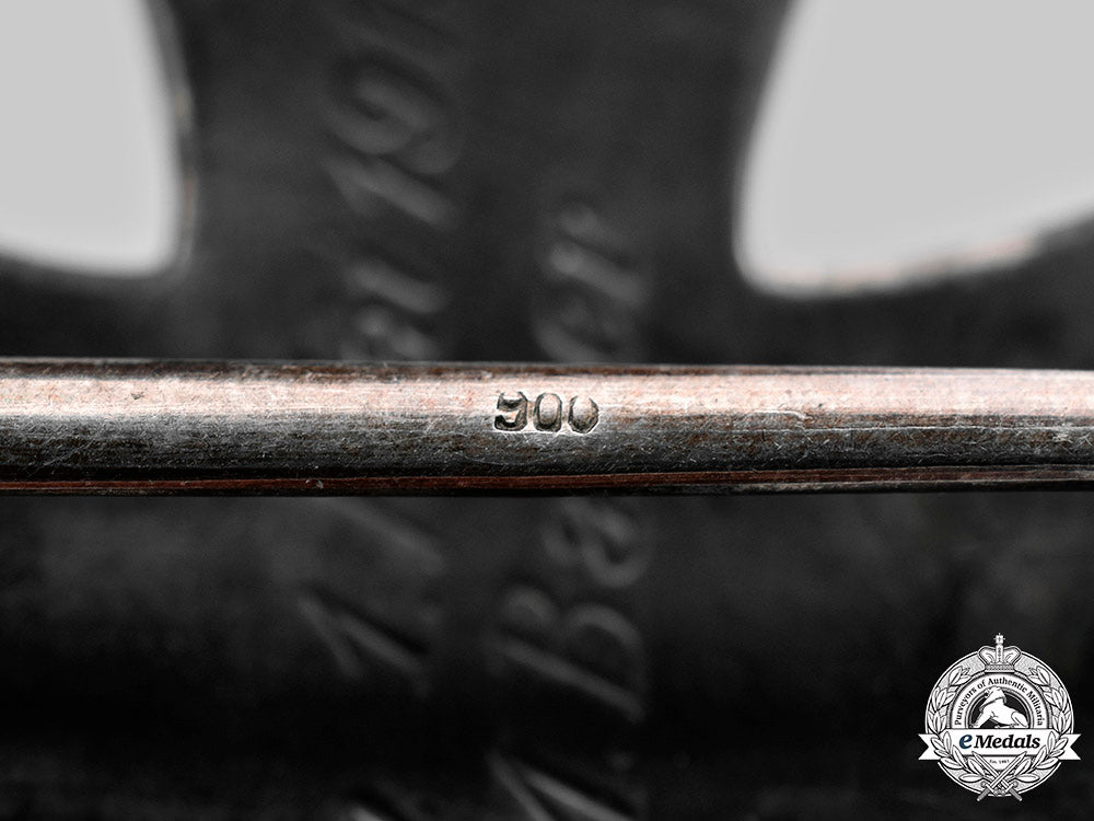 (Eisernes Kreuz 1914 I. Klasse). Reinstituted 5 August 1914. (1914-1918 issue). Constructed of iron and silver, consisting of a Cross Pattée with a blackened magnetic iron core within a ribbed silver frame, the obverse with a central initial “W”, the six o’clock arm with a reinstitution date of “1914”, the reverse with a barrel hinge and vertical pinback meeting a round wire catch, the reverse bearing an engraved inscription of “YPERN 1. MAI 1915, M. BAUER”, measuring 41.85 mm (w) x 41.74 mm (h), weighing 14.1 grams, a personalized example in extremely fine condition.