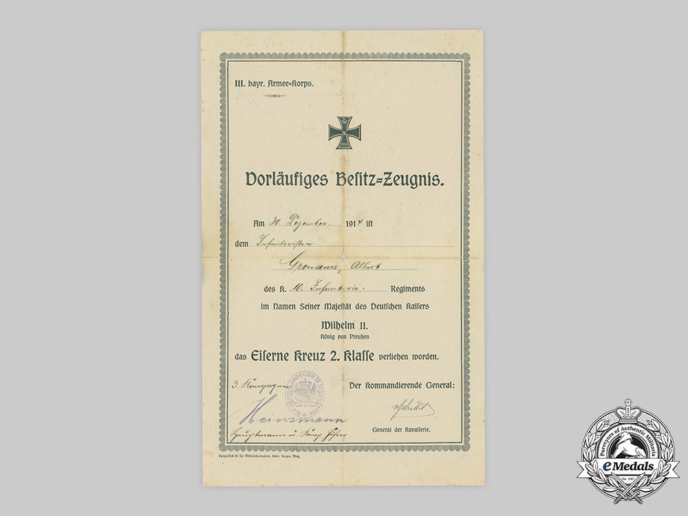 Germany, Imperial. A 1914 Iron Cross Ii Class Document To Private Albert Grondner