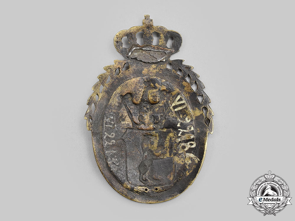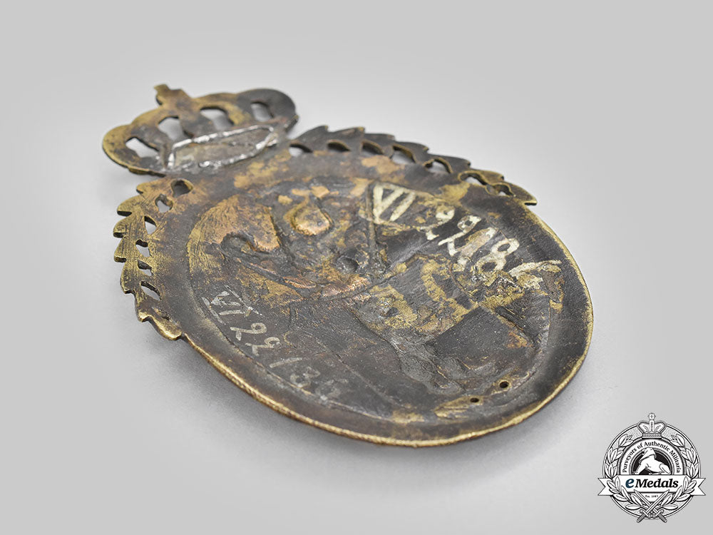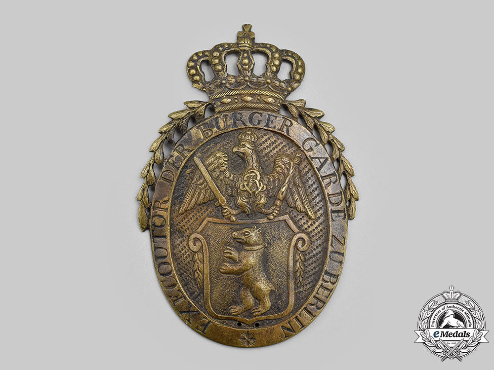 (Burger Garde Berlin Plakette). Constructed of bronze, the obverse bearing a central raised Berlin coat of arms topped by a Prussia imperial eagle, surrounded by an oval ring bearing an inscription of “EXECOUTOR DER BURGER GARDE ZU BERLIN”, topped by ac brown and laurel branches,the reverse bearing a handwritte code and date of “VI. 22. / 36” which appears to be a museum exhibit code, measuring 78 mm (w) x 112 mm (h), the reverse demonstrating evidence of the removal of a pinback apparatus, in very fine condition.