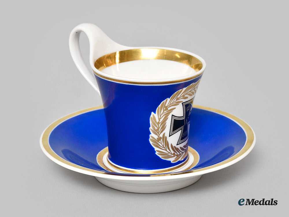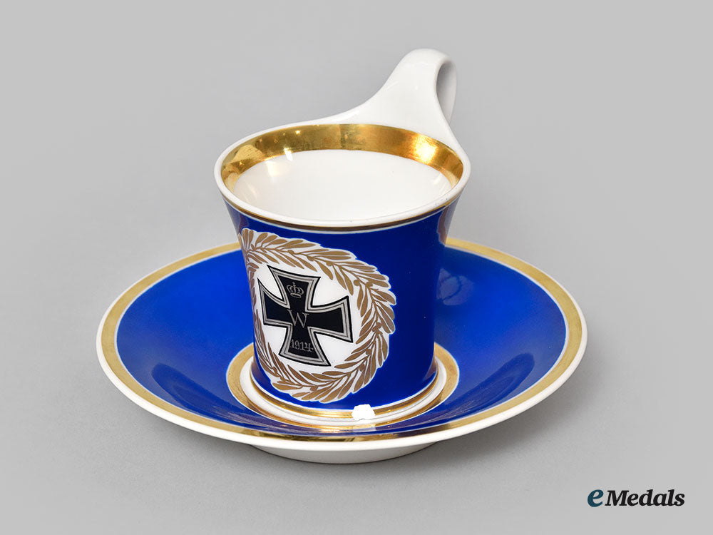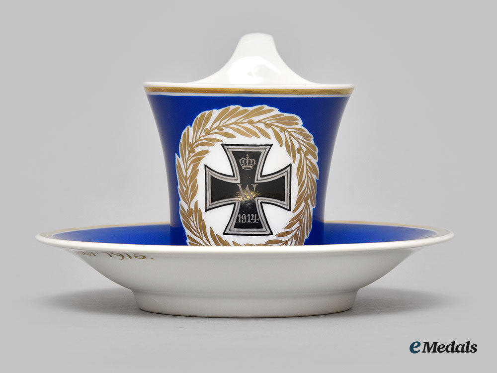 A short mug style teacup, blue glazed porcelain with a 1914 Iron Cross motif encircled by a gilt wreath opposite the handle a gilt ring on the interior lip and around the exterior base, handle plain, the bottom marked with the red orb, KPM, scepter and two iron crosses, numbered 103/106, measures 100mm (w) x 82mm (h), chip along the base and small scuff to handle, light wear to gilt, in very fine condition.
