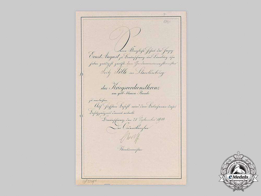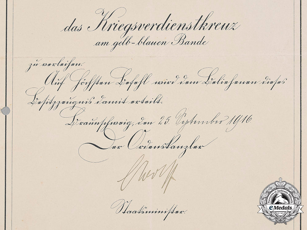 Germany, Imperial. A Brunswick War Merit Cross Certificate To Police Constable Tölle, 1916