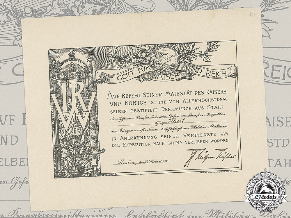 Germany, Imperial. A China Medal Award Document Chancellery Inspector Hugo Streit, 1901