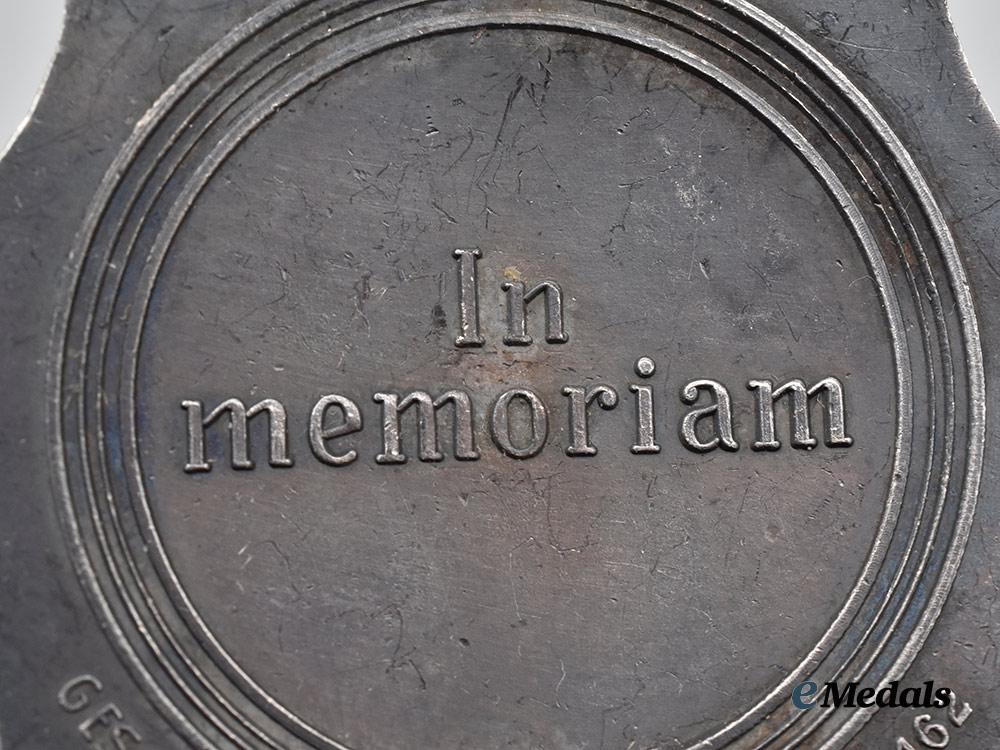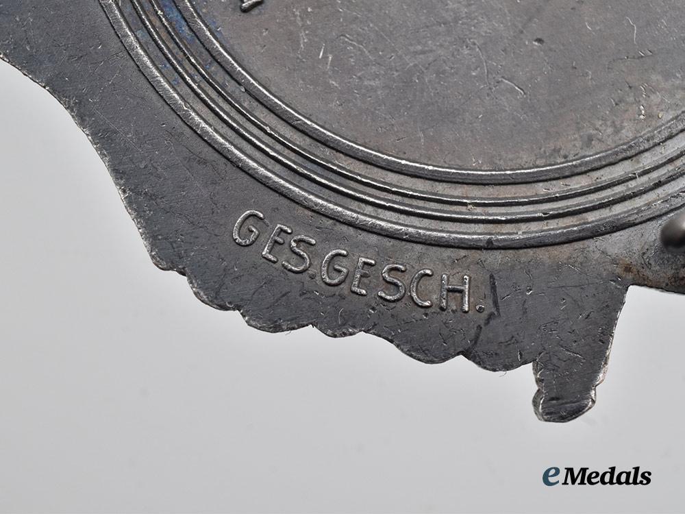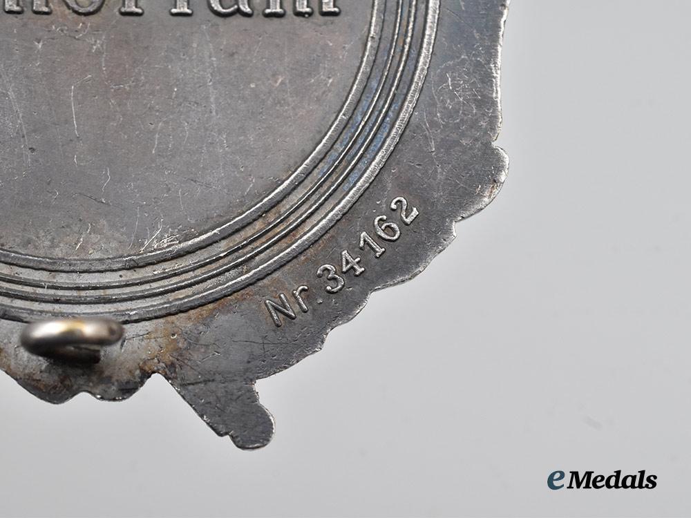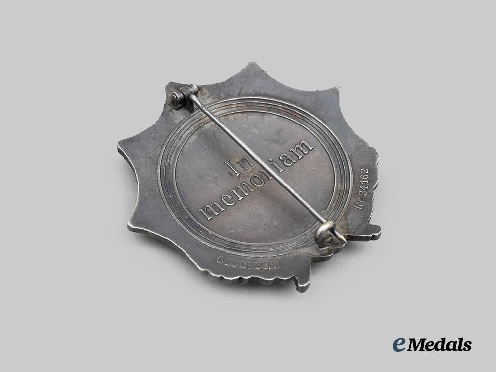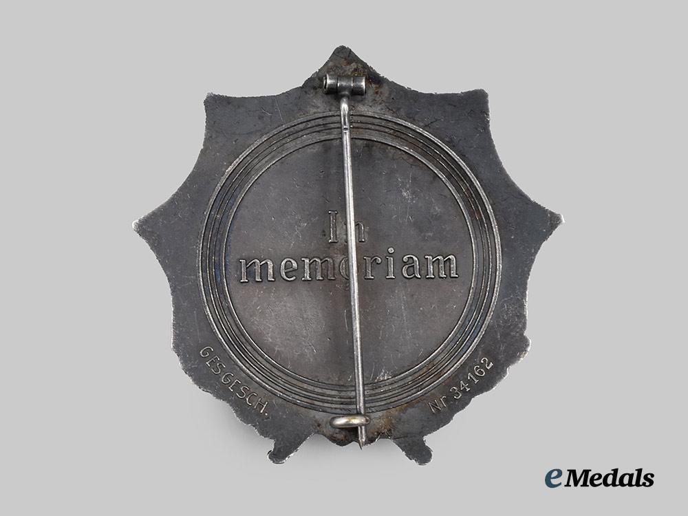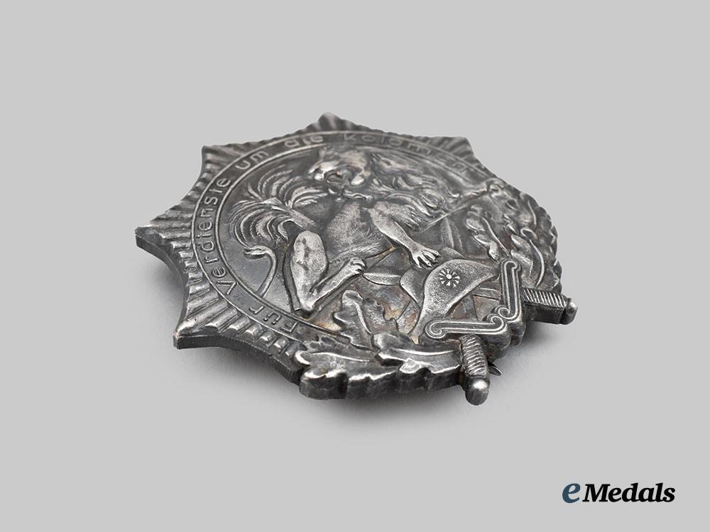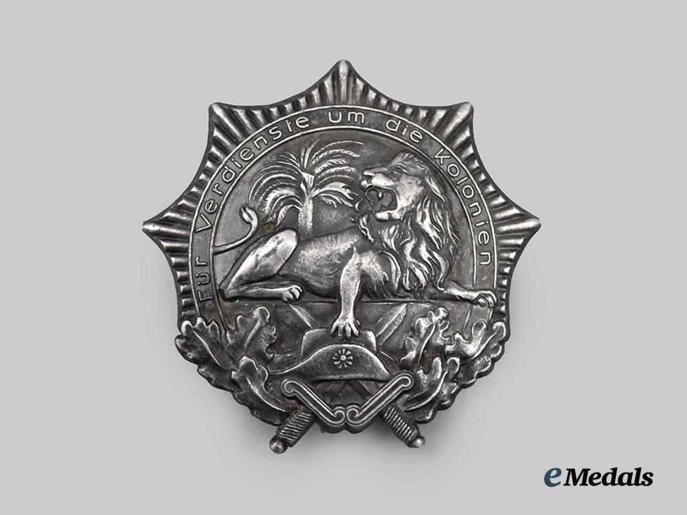 (Kolonialauszeichnung I. Klasse). Instituted 1922 by the Deutscher Kolonialkrieger-Bund. (1922-1935 issue). Constructed of a silvered bronze alloy, the obverse consisting of an eight-pointed radiant starburst, joined together at the bottom by a Schutztruppe-style slouch hat, superimposed over a pair of crossed swords and flanked by clusters of oak leaves, bearing a central prone lion with a palm tree visible in the background, circumscribed by an inscription of “FÜR VERDIENSTE UM DIE KOLONIEN” (“FOR SERVICES TO THE COLONIES”), the reverse bearing a central raised inscription of “IN MEMORIAM”, situated within a circular ribbed ring, featuring a legal registration code of “34162”, with a narrow barrel hinge and vertical pinback meeting a round wire catch, measuring 46.55 mm (w) x 45.39 mm (h), weighing 29.8 grams, a scarce and early example in extremely fine condition.