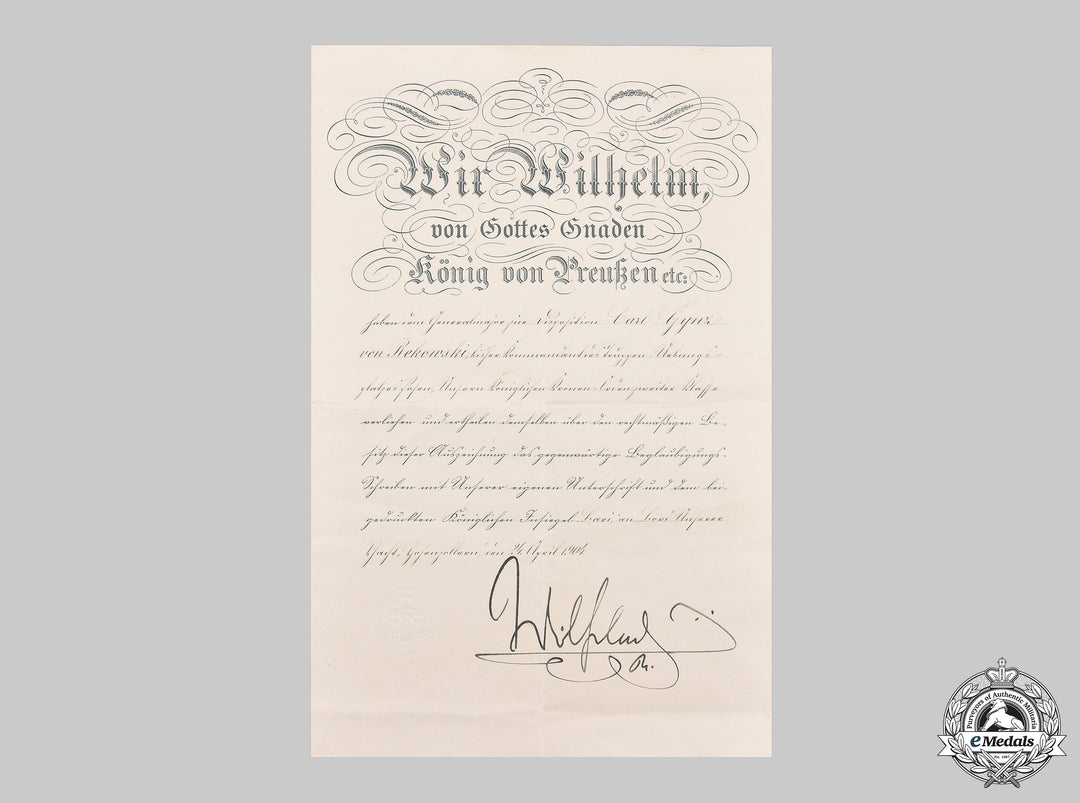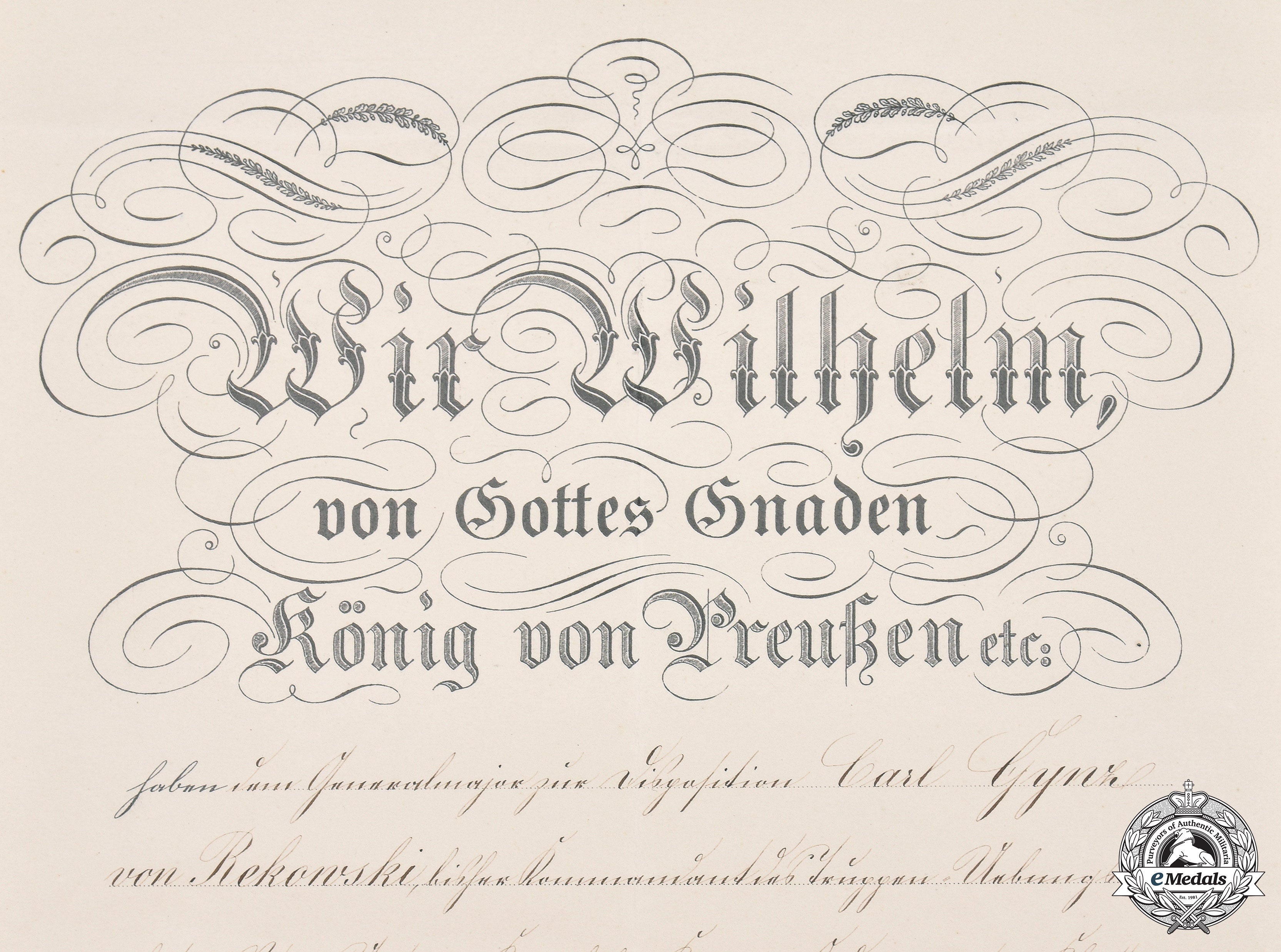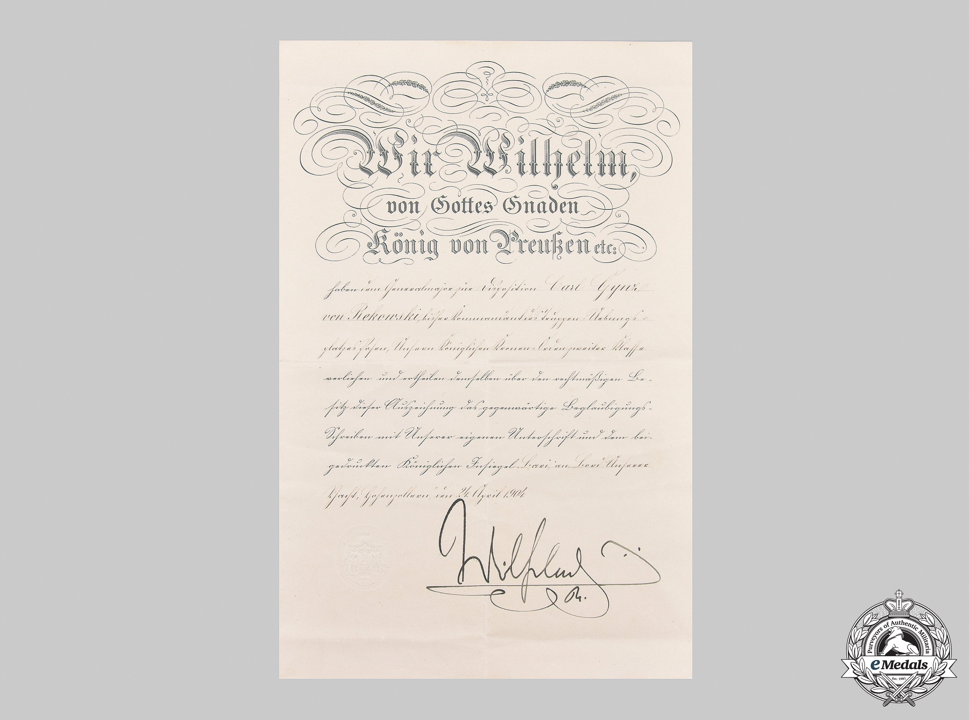 Germany, Imperial. A Crown Order Ii Class Document To Generalmajor Karl Gynz Von Rekowski, 1904