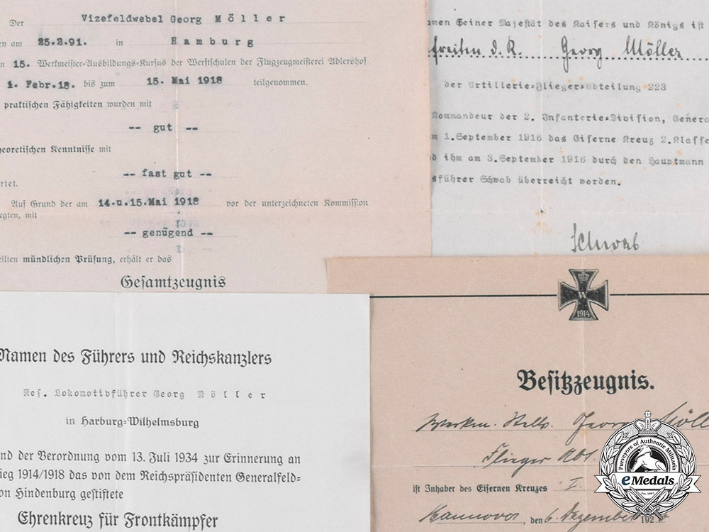 certificate of ownership of Iron Cross 1st Class; preliminary Iron Cross 2nd Class certificate; certificate of passing Werkmeister exam; Hindenburg Cross certificate.