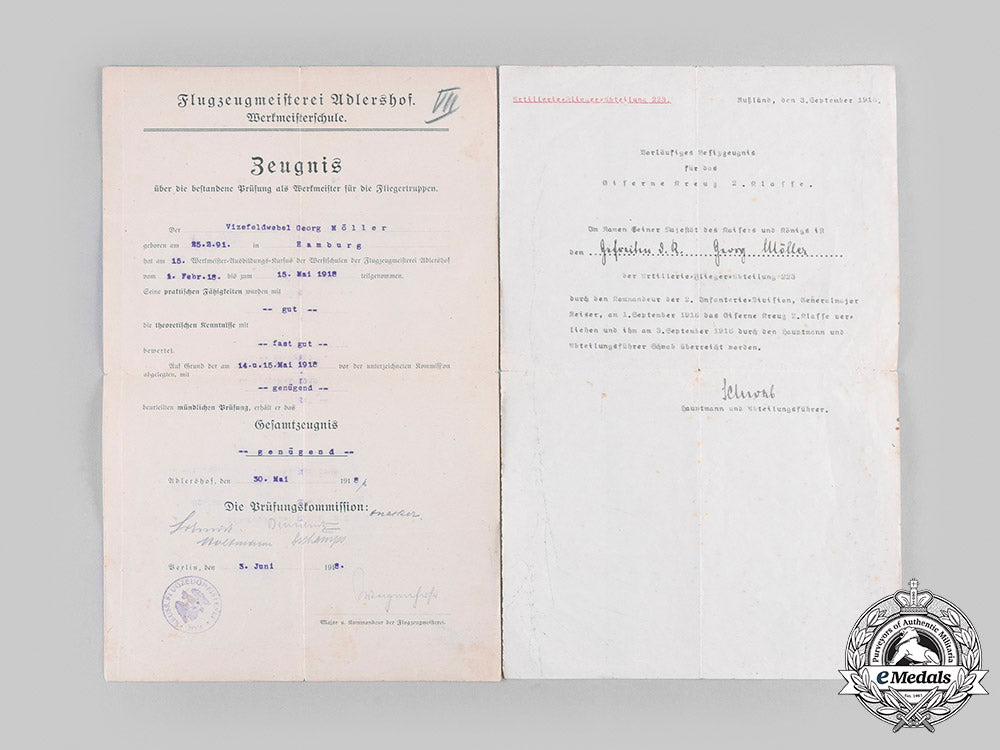 The exam certificate is named to Vizefeldwebel (vice sergeant) Georg Möller, born February 25, 1891 in Hamburg. He participated in a course to become a Werkmeister (senior technician) of the German Air Force between February 1 and May 15, 1918 and passed all exams. The certificate is dated to Adlershof on May 30, 1918, and to Berlin on June 3, 1918. Measuring 209 mm (w) x 328 mm (h), presenting multiple folding creases and light creasing and fraying of the edges, remains very fine.
