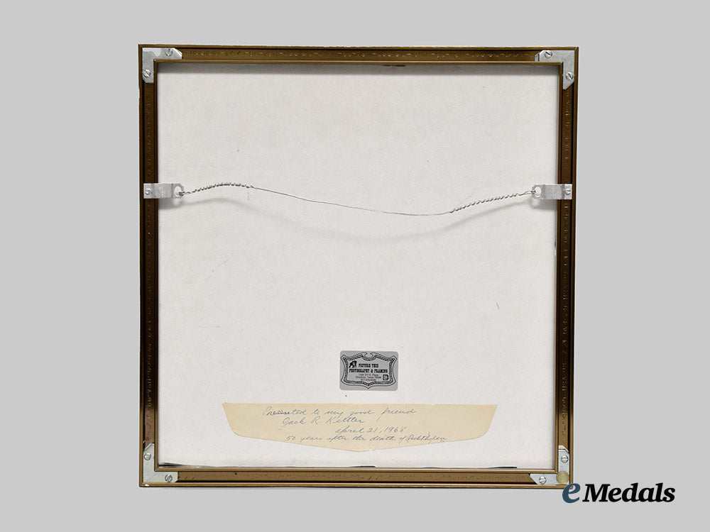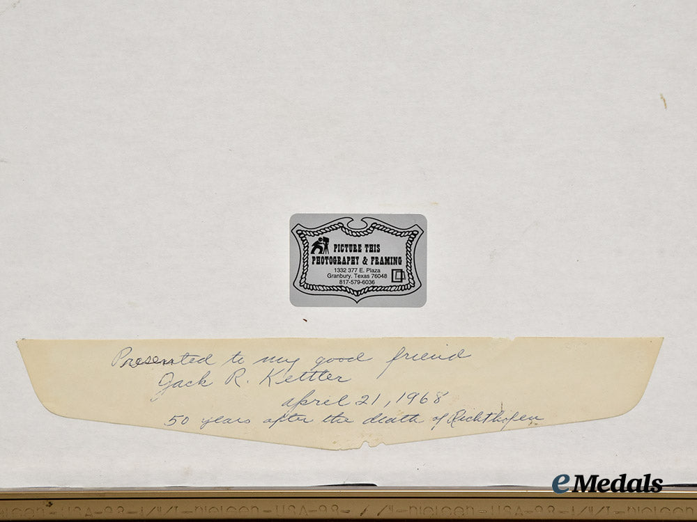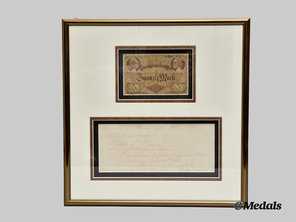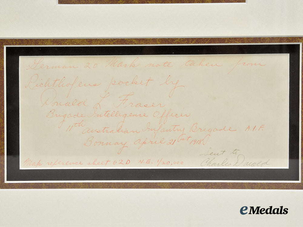 A unique commemorative display from the final moments of the life of Manfred von Richthofen (the “Red Baron”) assembled by a witness to his downing during aerial combat, consisting of a 20 Mark note retrieved post-mortem from the legendary fighter ace’s pocket following the crash landing of his Fokker Dr.I 425/17 triplane on 21 April 1918, situated above a letter indicating that the individual in question was Donald Lovat Fraser, an Intelligence Officer assigned to the 11th Australian Infantry Brigade, First Australian Imperial Force (AIF), a mining engineer and native of London who served with Australian forces during the First World War and who was a known witness to von Richthofen’s death, situated within a metal frame featuring an intact glass face and card stock board with custom-cut voids to allow viewing of both the note and letter in shadow box format, the reverse retaining a Texas photography and framing studio’s label and additional handwritten label indicating that the frame was gifted to Jack R. Kettler on 21 April 1968 in commemoration of the 50th anniversary of von Richthofen’s death, measuring 37.5 cm (w) x 38 mm (h), a fascinating momento of the Red Baron obtained by a noted witness to his demise in extremely fine condition.
