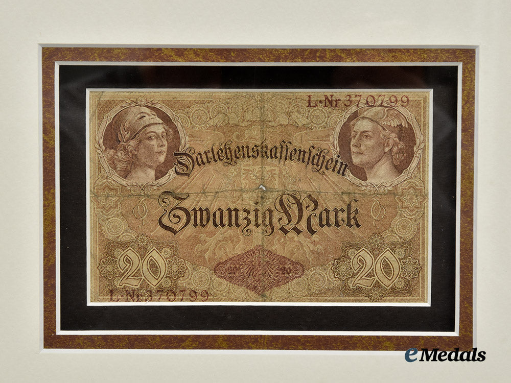Germany, Imperial. A Framed 20 Mark Note Retrieved from Manfred von Richthofen by Donald L. Fraser, Ex-Charles Donald Collection