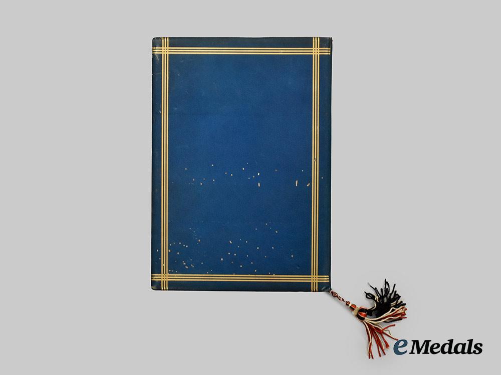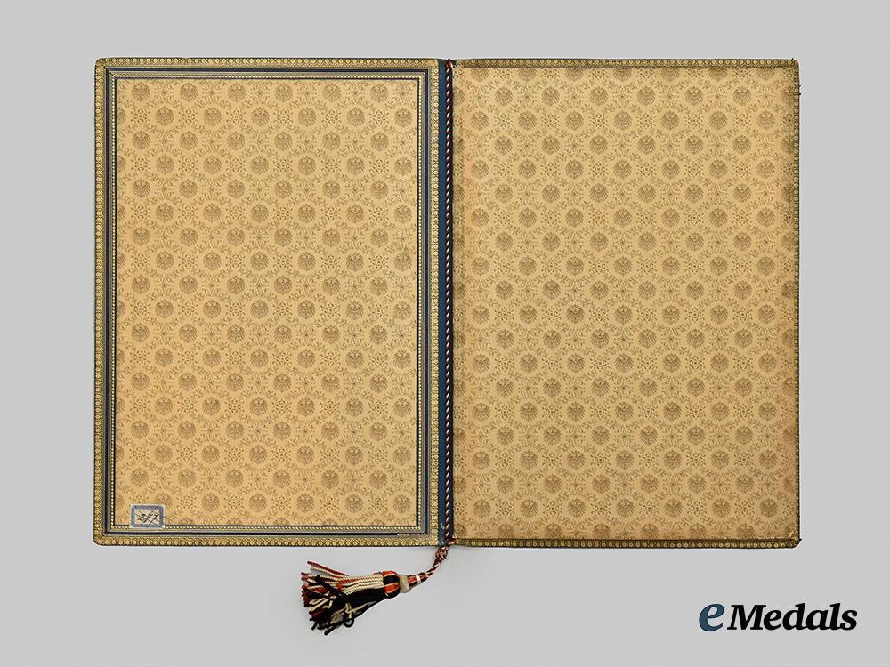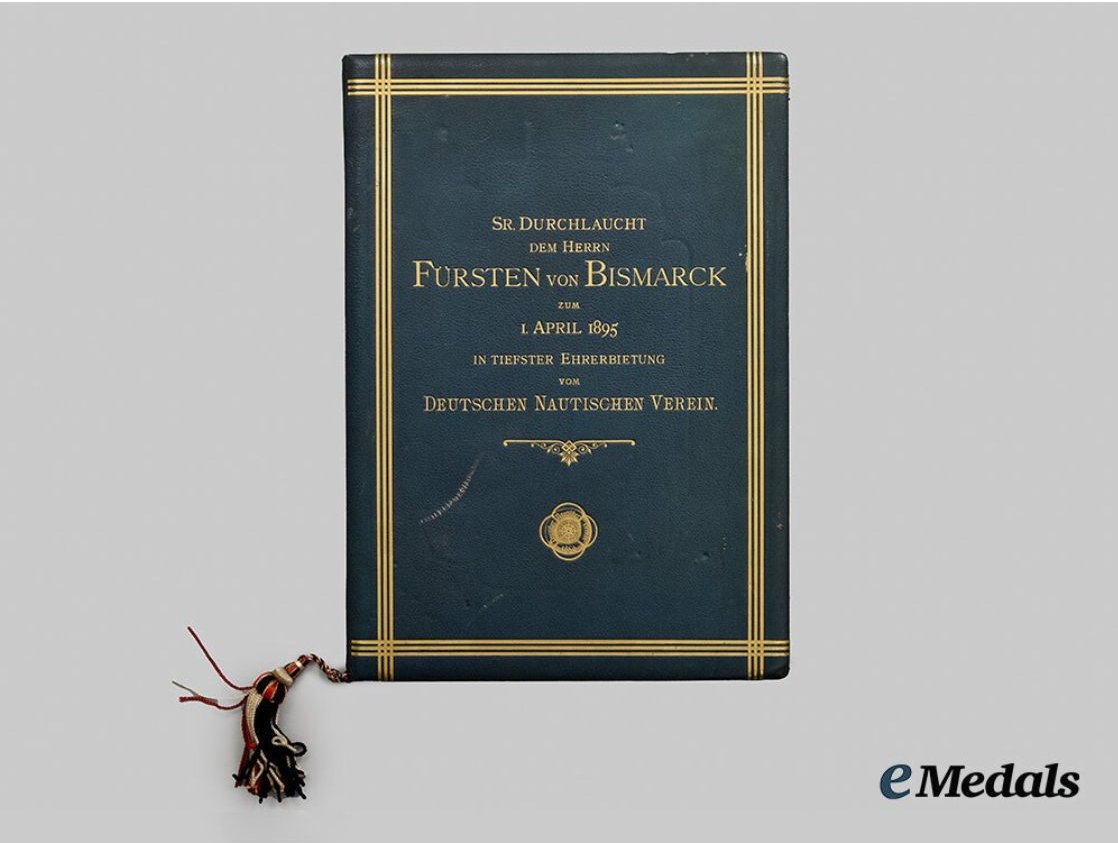 Presented to Otto von Bismarck on the occasion of his 80th Birthday. Issued by the Deutschen Nautischen Verein (German Nautical Association), constructed of a heavy card stock binding with a faux dark blue leatherette exterior liner, the cover bearing a gilded and embossed inscription of “SR. DURCHLAUCHT DEM HERRN FÜRSTEN VON BISMARCK ZUM I. APRIL 1895 IN TIEFSTER EHRERBIETUNG VOM DEUTSCHEN NAUTISCHEN VEREIN” (“TO HIS HIGHNESS THE PRINCE CHANCELLOR VON BISMARCK ON 1 APRIL 1895 IN DEEP REVERENCE FROM THE GERMAN NAUTICAL ASSOCIATION”), situated above the organizations ornate logo, the interior covers featuring elaborate embroidered liners bearing German national eagles situated within arabesque latticework, featuring heavy off-white card stock pages secured in place with a rope and tassel executed in black, white, and red German tri-colour threading, featuring a superb handwritten and illustrated dedication to the Chancellor for his 80th birthday, emphasizing the key role of naval matters in German history with a link to von Bismarck’s leadership, issued in Kiel on 1 April 1895, measuring 29 cm (w) x 41 cm (h), demonstrating minor material fatigue to the exterior, in extremely fine condition.