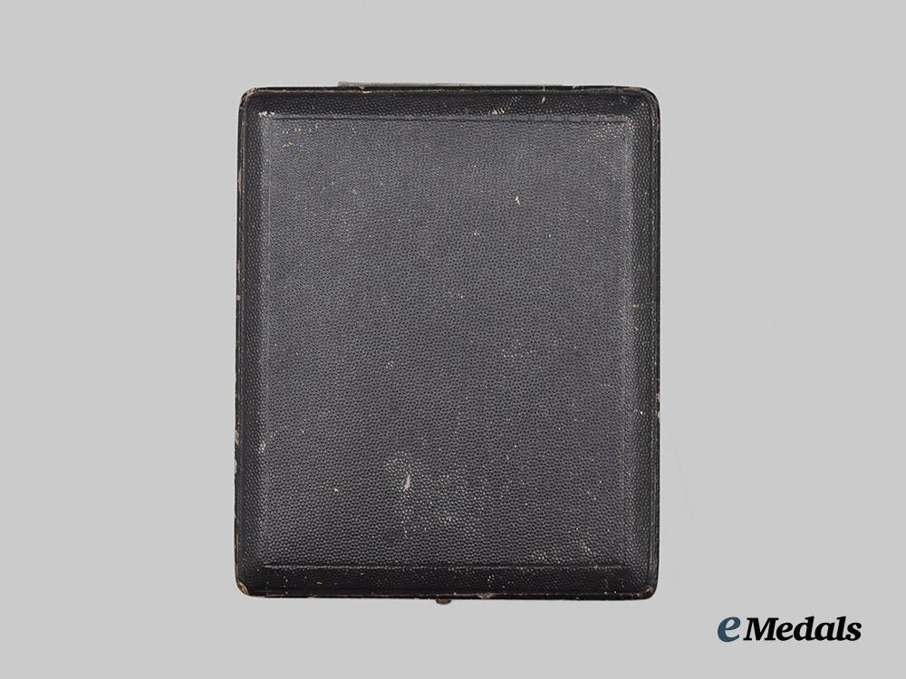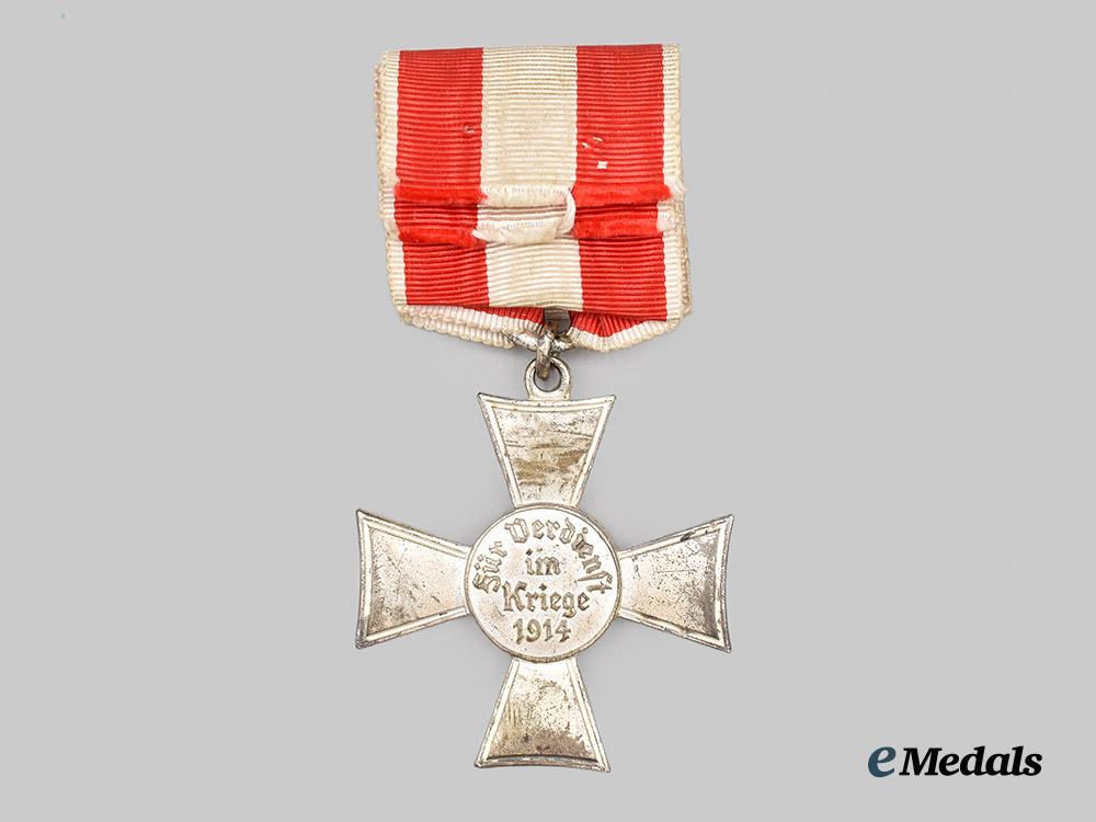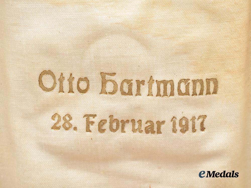 (Hanseatenkreuz Hamburg mit Etui). Constructed of silvered copper with enamels, on loop for suspension from its period original ribbon, consisting of a Cross Pattée, the obverse with red enameled arms, bearing a central red enameled medallion overlaid by a silvered Hamburg coat of arms, the reverse bearing a central raised inscription of “FÜR VERDIENST IM KRIEGE 1914” (“FOR MERIT IN WAR 1914”), unmarked, measuring 40.16 mm (w) x 44.08 mm (h), weighing 19.7 grams (inclusive of ribbon), accompanied by its original presentation case, constructed of a pressed card stock frame with a faux black leather exterior liner, the interior with a white satin lid liner bearing a gilt recipient’s name of “OTTO HARTMANN” and award date of “28. FEBRUAR 1917”, with a fitted and removable white velvet medal bed, closing with a metal spring catch with exterior stud release, the case demonstrating minor material fatigue which includes the loss of functionality to its catch, a scarce complete and owner-attributed set in overall near extremely fine condition.
