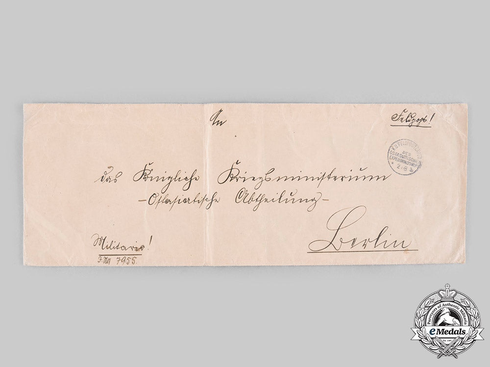 The envelope is addressed to the Royal War Ministry, East Asian Department, in Berlin. It is a Feldpost letter. On the front is an ink stamp from the East Asian Expedition Corps. The reverse shows two paper stamps of the Commander of the East Asian Expedition Corps. An ink stamp dates the letter to September 16, 1901.