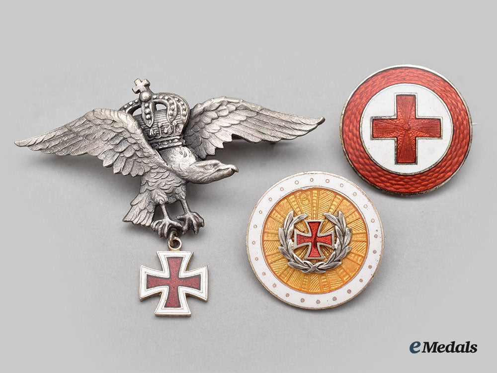 3. One constructed of silvered bronze with multi-coloured enamels, the obverse consisting of a white enameled disc, surrounding by a red enameled border, bearing a red Geneva Cross, the reverse with a horizontal pinback, unmarked, measuring 24 mm in diameter, in extremely fine condition.