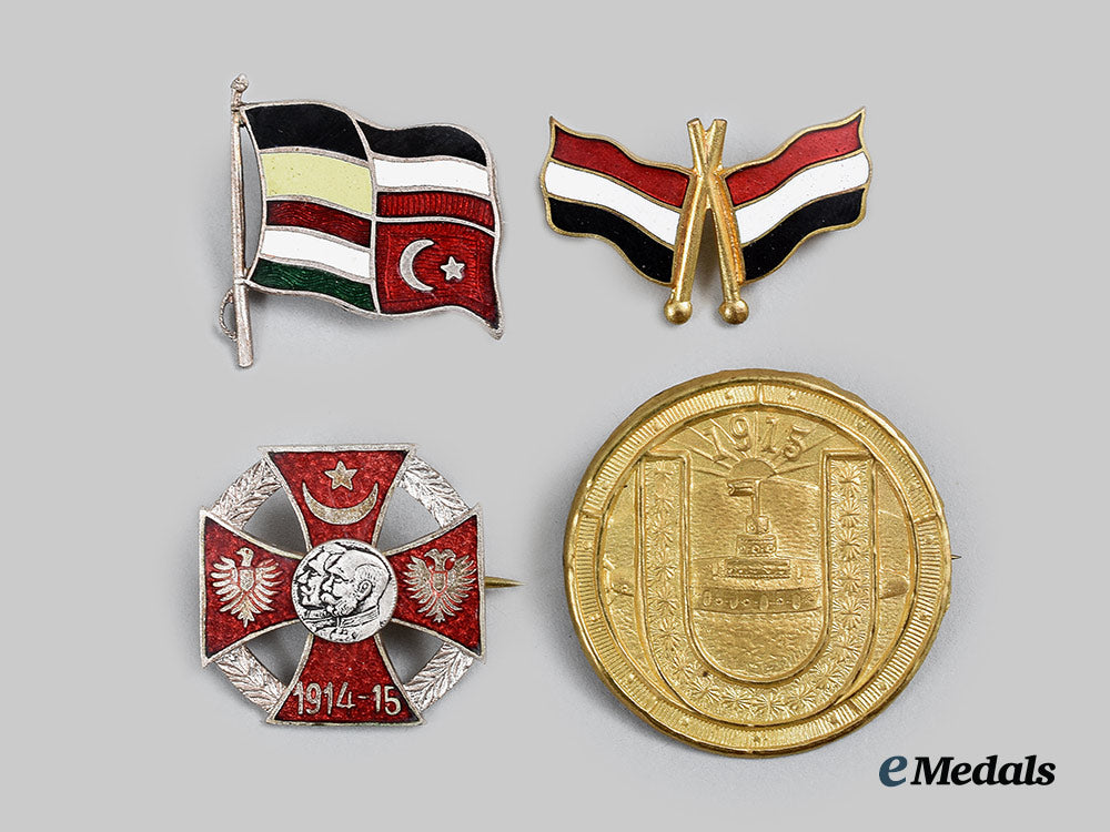 3. A Central Powers first war year badge, constructed of silvered bronze with enamels, consisting of a Cross Pattée with its arms joined together through the quadrants by a circular laurel leaf wreath, bearing a central medallion overlaid by leftward-facing profiles of Kaiser Wilhelm II and Emperor Franz Joseph, the arms bearing silvered symbols of Germany, Austria-Hungary, and the Ottoman Empire with dates “1914-15”, the reverse with a clip hinge and horizontal pinback meeting a flat wire catch, unmarked, measuring 22 mm (w) x 22 mm (h), in extremely fine condition.