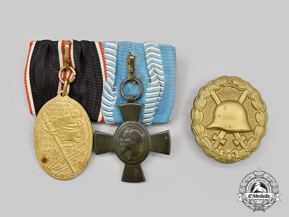 1. A medal bar featuring two decorations, including a Kyffhäuser Medal, constructed of gilded bronze, on loop for suspension with its period original ribbon, the obverse designer marked “HOSAEUS”, measuring 30.90 mm (w) x 47.21 mm (h), weighing 18.8 grams, in very fine condition, and; a Bavarian King Ludwig Cross, constructed of a patinated zink alloy, on loop for suspension with its period original ribbon, consisting of a Cross Pattée, the obverse bearing a raised and leftward-facing profile of King Ludwig III, the reverse bearing a central raised date of “7. 1. 1916”, unmarked, measuring 15.92 mm (w) x 21.86 mm (h), weighing 16.8 grams, in very fine condition; both suspended from 72 mm-long magnetic metal core with a horizontal pinback, the reverse demonstrating the loss of its original liner and with some bending visible to the King Ludwig Cross fixture, in very fine condition.