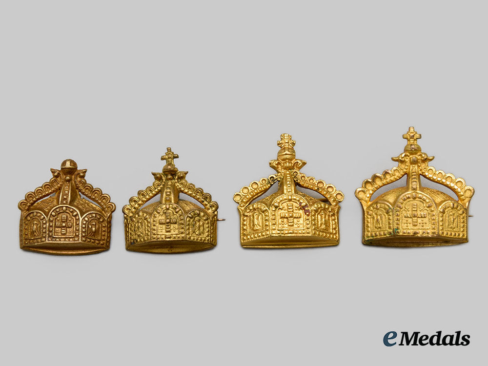 (Kaiserliche Marine Insignien). A lot of four Imperial Navy and Freikorps crown insignia, each constructed of gilded bronze, three featuring reverse horizontal pinbacks and one featuring two of three original attachment prongs, the former used on sleeve and cap insignia while the latter used specifically for visor cap attachment, of Imperial-era manufacture for naval use and identical to types used post-war by Freikorps Heydebreck, all unmarked and of various size, in overall better than very fine condition.