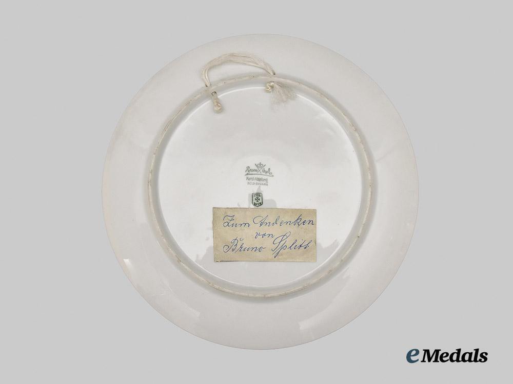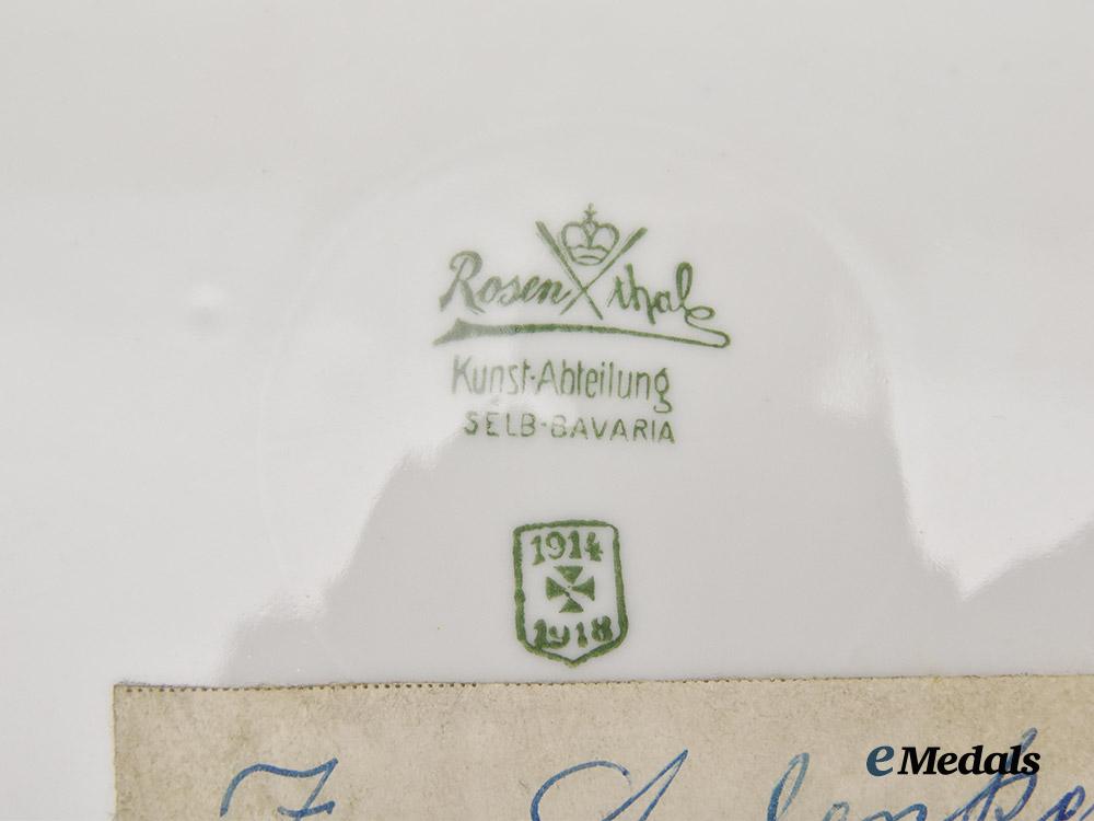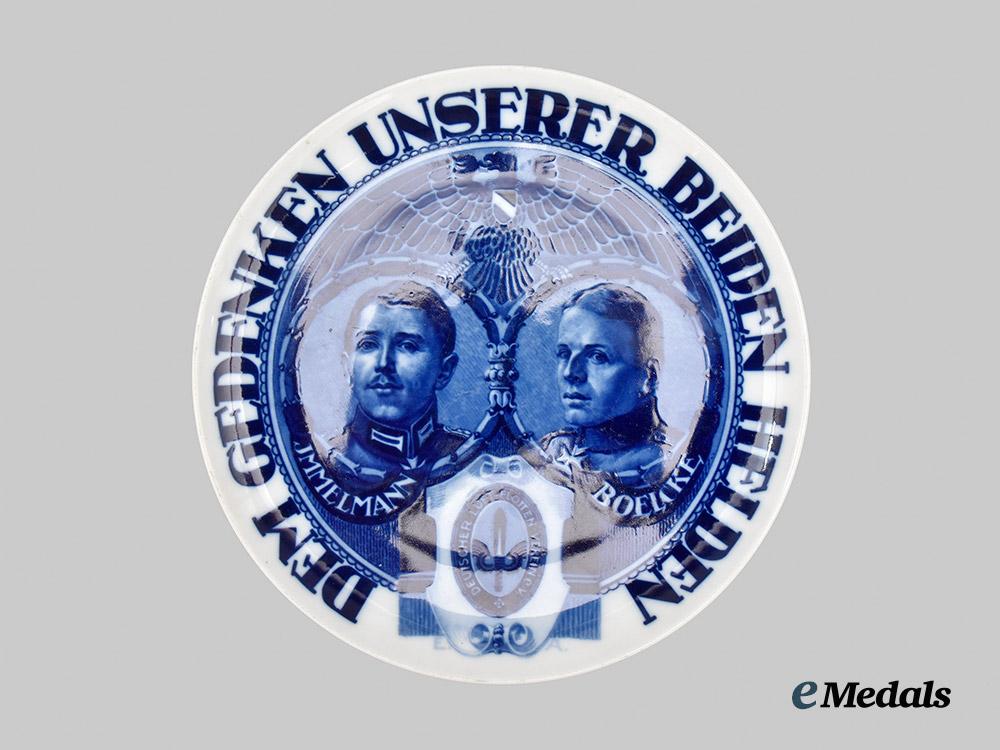 (Patriotischer Erinnerungsteller). Constructed of glazed white porcelain, the obverse bearing a blue underglaze German national eagle clutching dual circular laurel leaf wreaths, surrounding finely-detailed portraits of Max Immelmann and Oswald Boelcke, with the lower edge of each wreath overlaid by a banner bearing respective surnames, in turn situated above a banner bearing a the logo of the German Air Fleet Association, all circumscribed by an inscription of “DEM GEDENKEN UNSERER BEIDEN HELDEN” (“IN MEMORY OF OUR TWO HEROES”), the reverse perforated with two eyelets through which is looped an original drawstring for display, retaining a paper label bearing a handwritten gift dedication, maker marked with the logo of Rosenthal GmbH, Selb, measuring 23.5 cm in diameter, demonstrating minor flecking and scratching but with no evident chips or cracks, a superb period display piece in extremely fine condition.