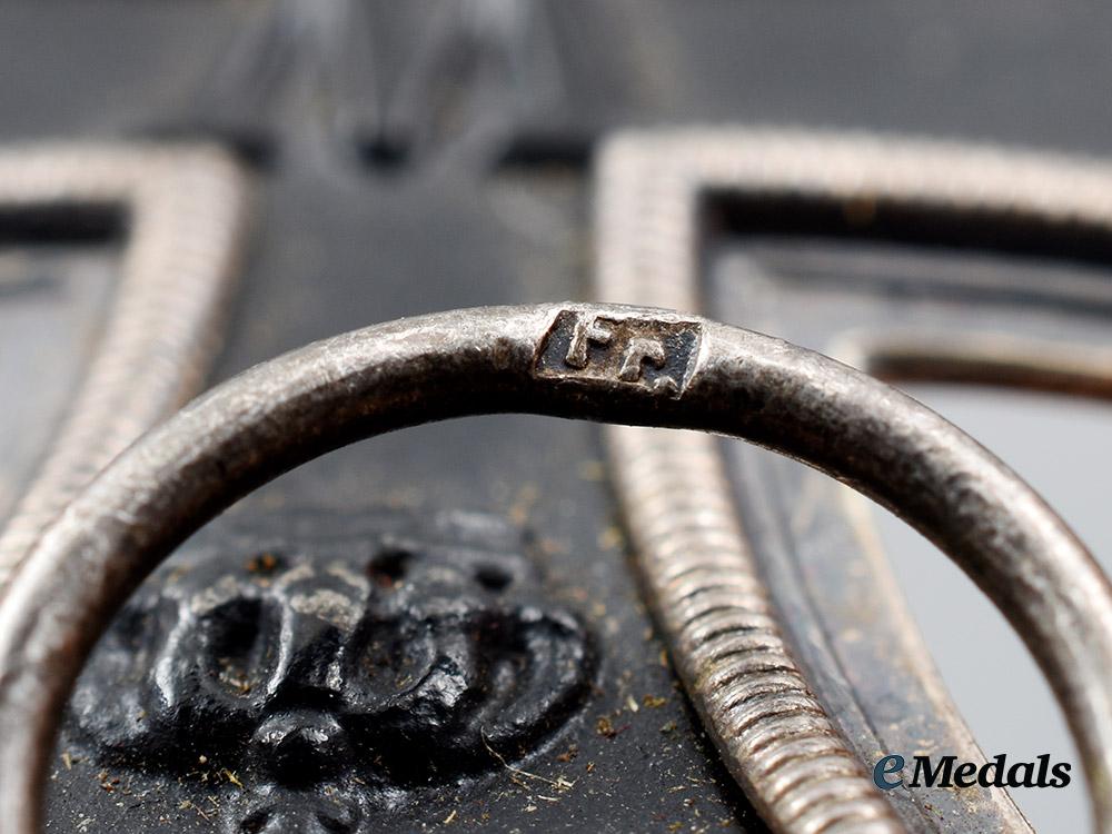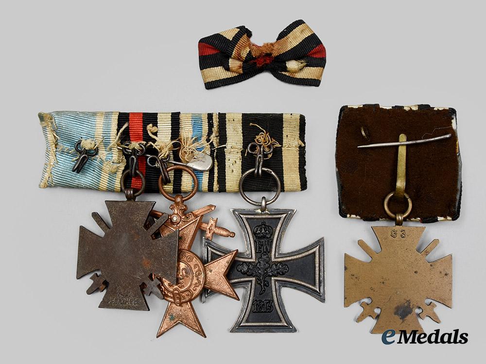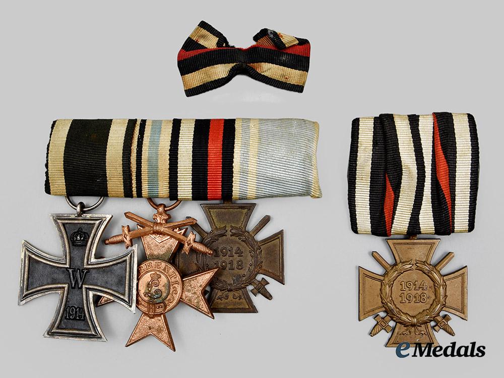 1. A medal bar featuring three decorations, including a 1914 Iron Cross II Class, constructed of iron and silver, on loop for suspension with its period original ribbon, consisting of a Cross Pattée with a blackened magnetic iron core within a ribbed silver frame, the obverse with a central initial “W”, the six o’clock arm with a reinstitution date of “1914”, the twelve o’clock arm with a royal crown, the reverse with three central oak leaves, the six o’clock arm with an initial institution date of “1813”, the twelve o’clock arm with initials “FW” topped by a royal crown, the suspension loop maker marked with the logo of Gebrüder Friedländer, Berlin, measuring 43.30 mm (w) x 47.66 mm (h), weighing 17.0 grams, in extremely fine condition, and; a Bavarian Military Merit Cross, III Class with Swords, constructed of coppered bronze, consisting of a Maltese Cross with pebbled arms, the obverse bearing a central raised monogram of King Ludwig II, situated within a stylized belt and buckle bearing an inscription of “MERENTI” (“MERIT”) with arabesques, the twelve o’clock arm riveted with a crossed sword clasp, the reverse bearing a central raised Bavarian lion rampant, situated within a stylized belt and buckle bearing an institution date of “1866” with arabesques, topped by a stylized suspension and loop with a period original ribbon, unmarked, measuring 42.32 mm (w) x 50.24 mm (h), demonstrating some tarnishing, in near extremely fine condition, and; an Honour Cross of the World War 1914/1918 for Combatants, constructed of bronzed magnetic metal, on loop for suspension with its period original ribbon, consisting of a Cross Patté with crossed swords piecing the centrepiece, the obverse bearing central wreathed dates “1914-1918”, the reverse maker marked with the logo of Reichsverband Pforzheim, measuring 38.08 mm (w) x 42.63 mm (h), in very fine condition; accompanied by a 90 mm-long bar with a magnetic metal core, retaining a ribbon for a Bavarian Long Service Award which has been lost to time, with additional detachment of the Iron Cross and Honour Cross, in overall fair condition.