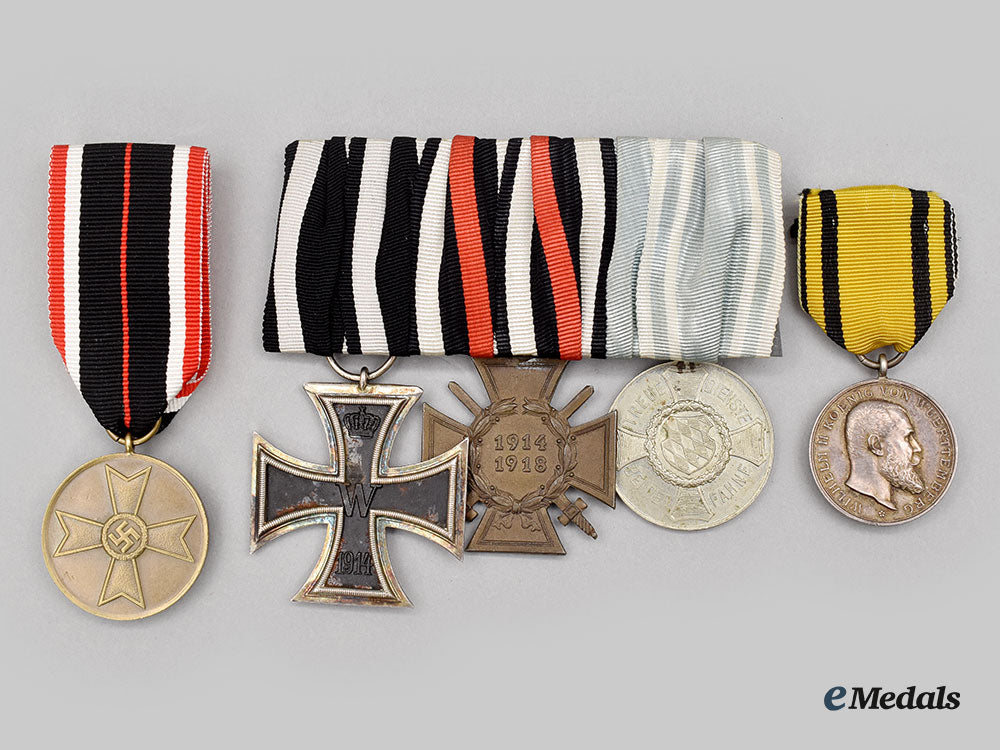 1. A medal bar featuring three decorations, including a 1914 Iron Cross II Class, constructed of iron and silver, on loop for suspension with its period original ribbon, consisting of a Cross Pattée with a blackened magnetic iron core within a ribbed silver frame, the obverse with a central initial “W”, the six o’clock arm with a reinstitution date of “1914”, the twelve o’clock arm with a royal crown, the reverse with three central oak leaves, the six o’clock arm with an initial institution date of “1813”, the twelve o’clock arm with initials “FW” topped by a royal crown, unmarked, measuring 42.36 mm (w) x 46.13 mm (h), weighing 16.8 grams, in very fine condition; an Honour Cross of the World War 1914/1918 for Combatants, constructed of bronzed magnetic metal, on loop for suspension with its period original ribbon, consisting of a Cross Pattée with crossed swords piercing the centrepiece, the obverse bearing central wreathed dates of “1914-1918”, the reverse maker marked with the logo of an unidentified manufacturer, measuring 38.10 mm (w) x 42.70 mm (h), weighing 15.2 grams, in near extremely fine condition, and; a Bavarian Long Service Award, III Class for 9 Years, constructed of neusilber, on loop for suspension with its period original ribbon, unmarked, measuring 33.17 mm in diameter, weighing 14.4 grams, in extremely fine condition; all suspended from a 100 mm-long zink bar with a horizontal pinback and black wool reverse liner, in extremely fine condition.