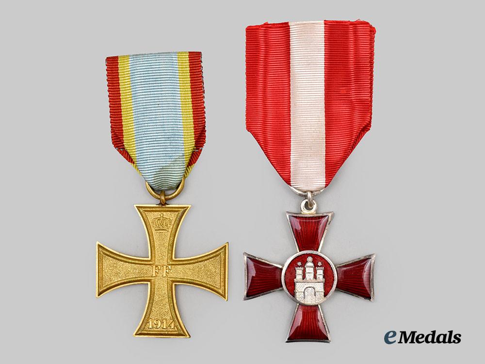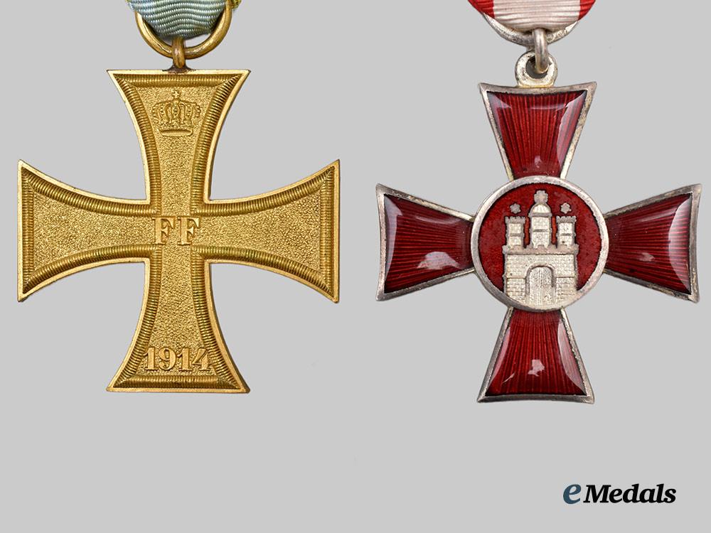 2. A Hamburg Hanseatic Cross, constructed of silvered copper with enamels, consisting of a Cross Pattée, the obverse with red enameled arms, bearing a central red enameled medallion overlaid by a silvered Hamburg coat of arms, the reverse bearing a central raised inscription of “FÜR VERDIENST IM KRIEGE 1914” (“FOR MERIT IN WAR 1914”), topped by an integral loop with dual rings retaining a replacement ribbon, unmarked, measuring 40.28 mm (w) x 44.11 mm (h), weighing 19.5 grams, demonstrating minor flecking to the enamels, in near extremely fine condition.