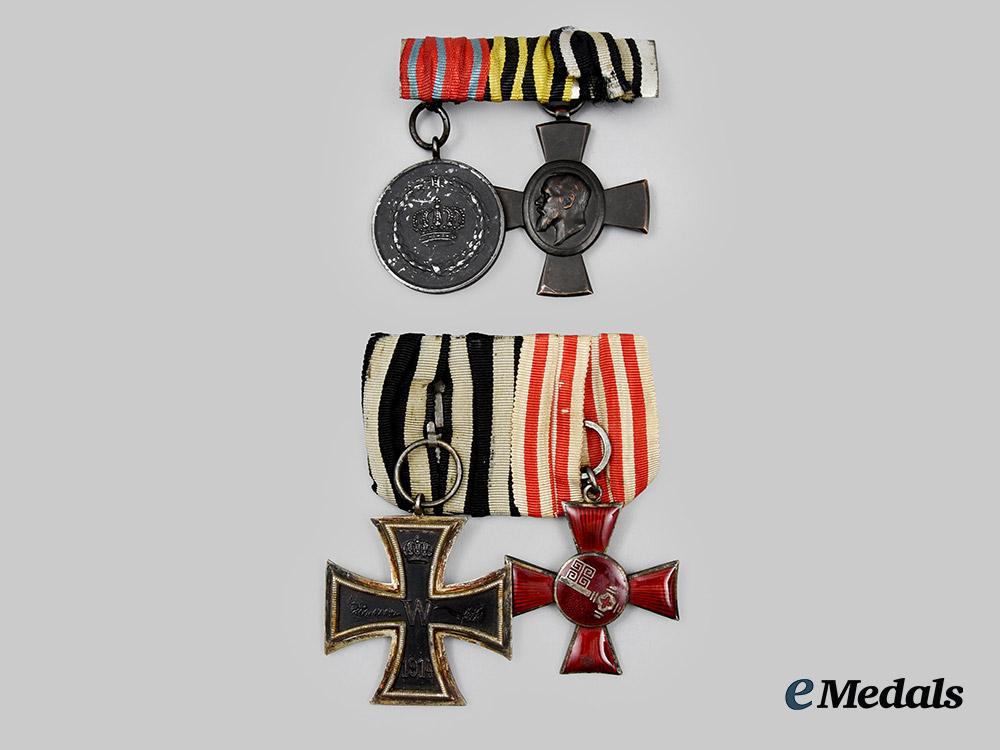 1. One featuring two decorations, including a 1914 Iron Cross II Class, constructed of iron and silver, on loop for suspension with its period original ribbon, consisting of a Cross Pattée with a blackened magnetic iron core within a ribbed silver frame, the obverse with a central initial “W”, the six o’clock arm with a reinstitution date of “1914”, the twelve o’clock arm with a royal crown, the reverse with three central oak leaves, the six o’clock arm with an initial institution date of “1813”, the twelve o’clock arm with initials “FW” topped by a royal crown, the loop maker marked “KO” for a widely-documented but unidentified manufacturer, measuring 42.81 mm (w) x 47.97 mm (h), weighing 15.4 grams, in very fine condition, and; a Bremen Hanseatic Cross, constructed of silvered copper with enamels, on loop for suspension with its period original ribbon, consisting of a Cross Pattée, the obverse with red enameled arms, bearing a central red enameled medallion overlaid by a silvered Bremen coat of arms, the reverse bearing a central inscription of “FÜR VERDIENST IM KRIEGE 1914” (“FOR MERIT IN WAR 1914”), unmarked, measuring 39.61 mm (w) x 43.62 mm (h), weighing 18.8 grams, demonstrating some flecking and scratching to the enamels, in better than very fine condition; both suspended from a 60 mm-long magnetic metal bar with a horizontal pinback and red wool reverse liner, unmarked, demonstrating soiling to the ribbons and mothing throughout the liner, in very fine condition.