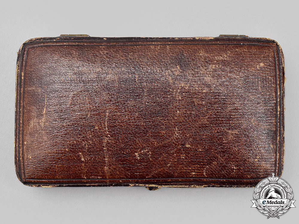 3. Both concealed within a custom storage case, constructed of a light two-piece wooden frame, the exterior with a faux brown leather liner, the interior with a padded dark grey satin lid liner, featuring a maroon velvet medal bed with two depressions perfectly cut to accommodate the accompanying awards, unmarked, measuring 105 mm (w) x 60 mm (l) x 25 mm (h), the exterior liner demonstrates moderate material fatigue and the spring catch no longer functions properly, in very fine condition.