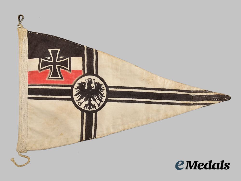 (Reichskriegsflagge Wimpel). Constructed of white cotton twill, featuring a double-sided dyed black Nordic Cross, overlaid by a central German imperial eagle, with a War Ensign set into the upper hoist edges, the hoist edge reinforced with an additional white cotton twill channel retaining a rope completing at one end in a functional metal spring clip, unmarked, measuring 31.5 cm (w) x 18.5 cm (h), demonstrating moderate soiling throughout, in better than very fine condition.