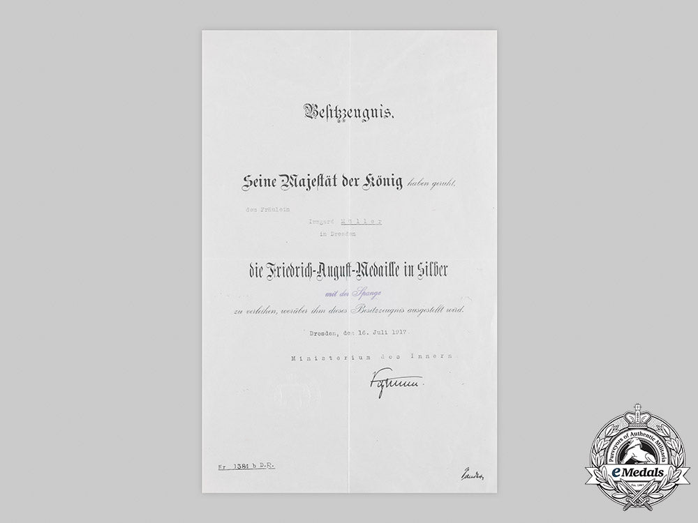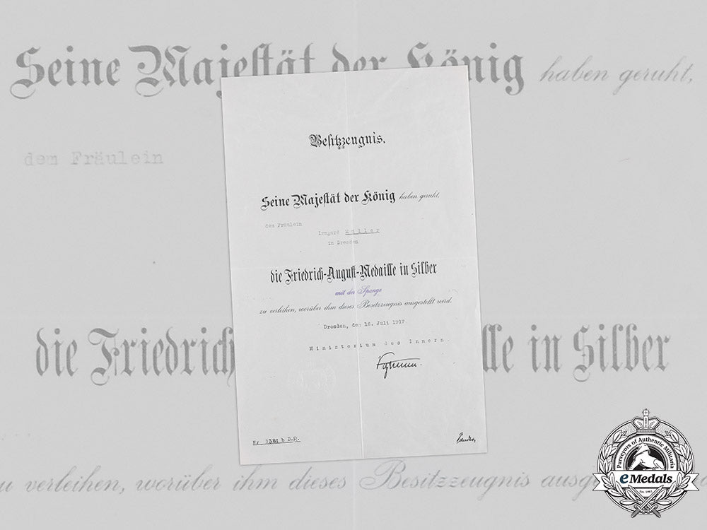 The Saxon Friedrich August Medal in Silver with Clasp certificate is named to Miss Irmgard Müller. Dated to Dresden on July 16, 1917.