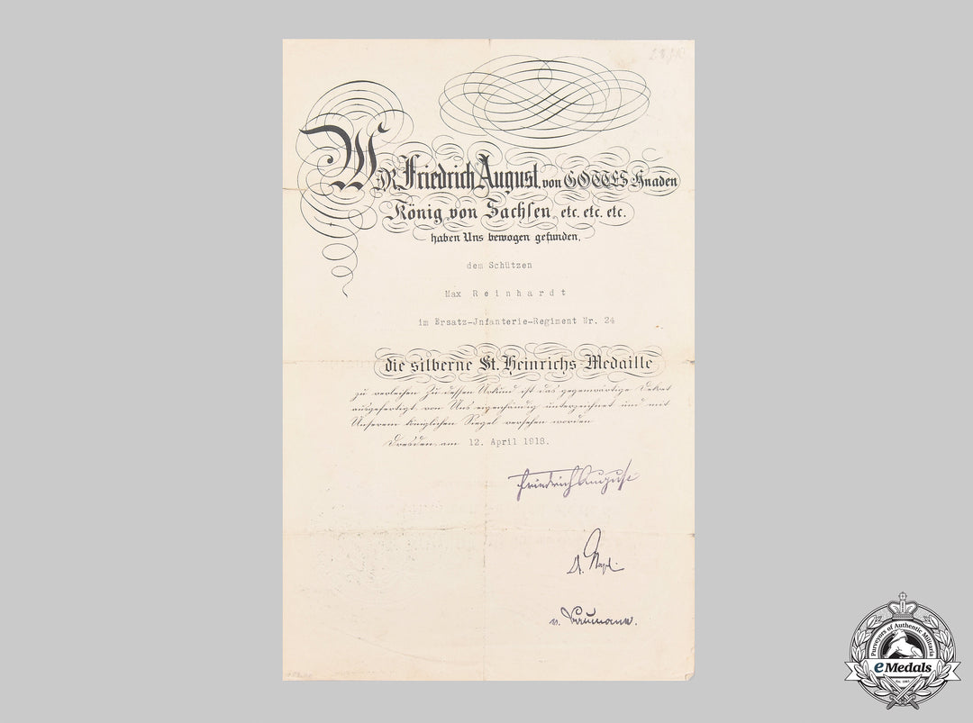 Germany, Imperial. A Saxon Military Saint Henry Order Silver Medal Document, 1918