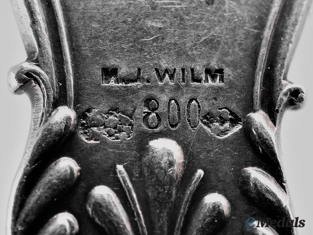 A fork constructed of silver, the obverse presents an arabesque detailing at the neck, with a fluted stem and arabesque detailed handle with a central monogram of Kaiser Wilhelm II, ending with an arabesque tip, the reverse mimics the front, the handle bears the silver content mark of a crescent moon, unidentified symbols and “800”, and the maker mark “H. J. Wilm”, measuring 176 mm (l) x 23.58 mm (w), extremely fine with obvious signs of wear.